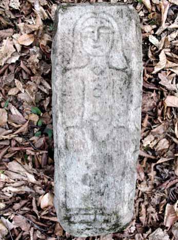 various wine vessels, and perhaps a comb and a mirror depicted on the side areas by the head. The tradition of depicting personal items such as a mirror and comb, typical of the gravestone décor in Kvemo Kartli, is often associated with superstitious or mystical views about the souls of the departed. There