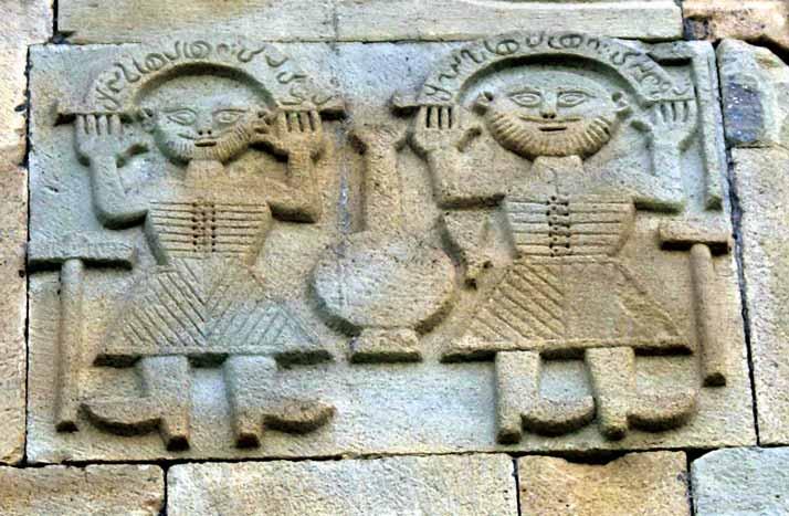one of the sides of the tomb. It is separated by a border of lily ornaments. The frontal depictions of three men standing side by side are carved on the left; two of them are holding their arms akimbo, while the third holds his arms crossed over his chest. The grim-looking figures, wearing long tunics with belts indeed almost flat, low relief. A large square shape is carved in the upper left corner of the composition, surrounded by a frame. This shape is a relatively common motif in the gravestone décor of this period. It even a loom. At the right of the frieze, different wine vessels are arranged in a line: a jug, a kula (a wooden sura karkara (a the centre. The tree of life is depicted in all four corners of the gravestone. The compositions of the sides covered with different types of drinking vessels, where each item is surrounded by a low ogee arch, slight movements, where each figure and vessel are separated from one another by arches resting on pillars. One of the three men, whose depiction is distinguished by its low relief, its generalized forms and with his legs crossed. The other two men also seem to be depicted seated: one of them is pouring wine into a cup from a jug, while the other one is holding his arms akimbo and looks as though he is depicted in movement. From this time onwards, scenes representing feasts, with their specific iconographic pattern, become a common feature of gravestone décor. It is worth noting that this theme became common in the th th postures, signifying a farewell to this life, creates a somewhat abstract scene through the laconism and conventionality of the presentation; the feeling of detachment is further emphasized by the placement of each figure under a separate arch.