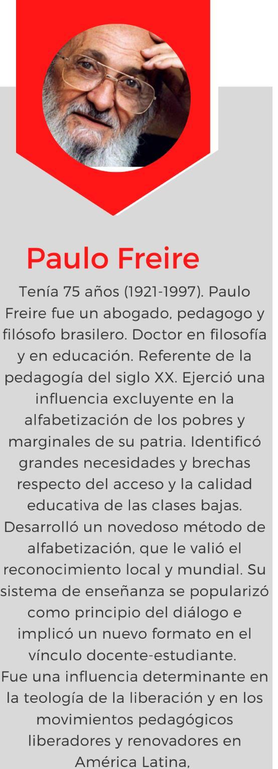 Desde el autory educador brasileño Paulo Freire6 Comoeducador,ycomopolíticonos propone una reflexión crítica sobre lasvirtudesdeleducador.Comouna cierta forma de ser, de encarar, comprendery comportarse, queuno crea a través de la práctica política, enbúsquedadelatransformaciónde la sociedad. En el sentido de CREARSE hacia una sociedad más justa.