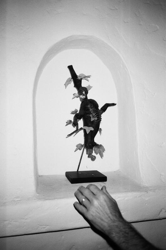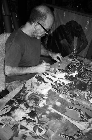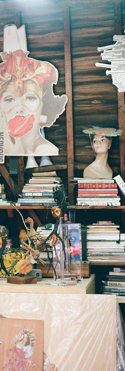 Carlos used to run Yamashiro Restau rant—the Olympus of Hollywood. He was always working on something, lugging Japanese lanterns or found doll heads back and forth from the restau rant to his house. Sitting in his studio, through the smell of glue and sawdust, we realized where this madness comes from, it’s that intense passion one has in trying to figure out the meaning of life. Some drive through it, others saunter, but Carlos chooses to collage himself across it. Talking to Carlos we were reminded that creating has always and will always come from within—it nev er comes fast enough and oftentimes is over too soon. It was never meant to be forever.
