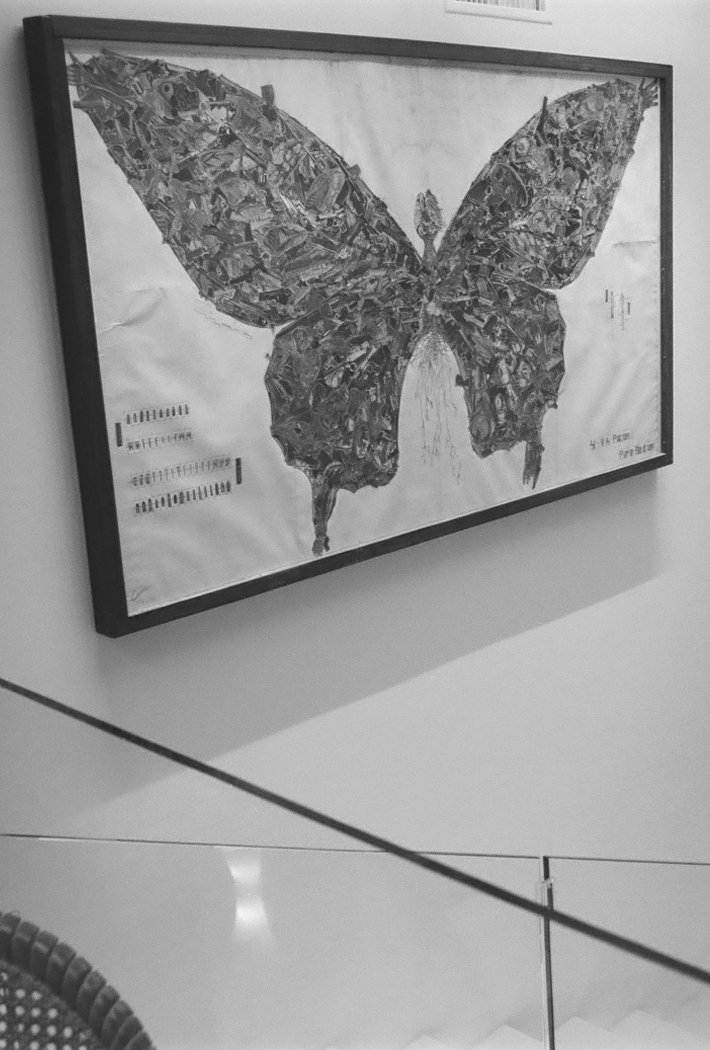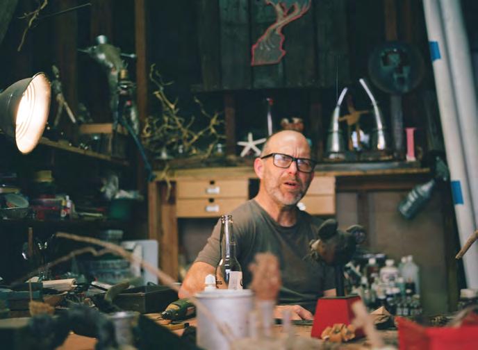 What do I do? You know, the inten tion? Because that’s a loaded word. The intention is obviously connec tion, right? I want to connect. But it’s a lonesome process too. It’s sort of ironic that my intention is to connect but I don’t have any con nection in doing it. So then my con nection is when I’m out, the lone wolf process of going to collect my stuff. It’s really an act of collecting and then assembling and collaging my intentions and who I am. When I was younger, a lot of my work was about the message I wanted to give. And a lot of it’s about questions I prefer to ask. The older you get, the more questions you have. Strange. You know, you guys are pretty grounded, but when I was your age, I knew I was the shit. I knew everything. Now I don’t know shit. I know that I found meaning in collecting other people’s waste or nature’s waste and trying to make a powerful query out of it. A state ment, I guess you could say. But I’m never quite sure what it is I’m doing because if I really look into it, there are so many what-ifs? Or whys? It’s a broad question, but I would say the intention is always to be able to work wherever I am, whenever I can, and the easiest way I’ve found in this scale is to work with things I find because it’s a never-ending sort of “Wow. That’s a cool shape. That’s something that I can manipulate— that’s something that can manipu late me.”