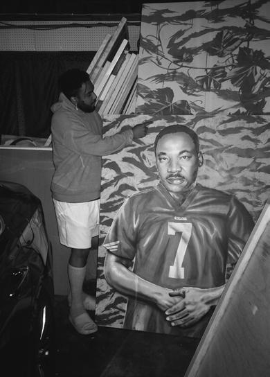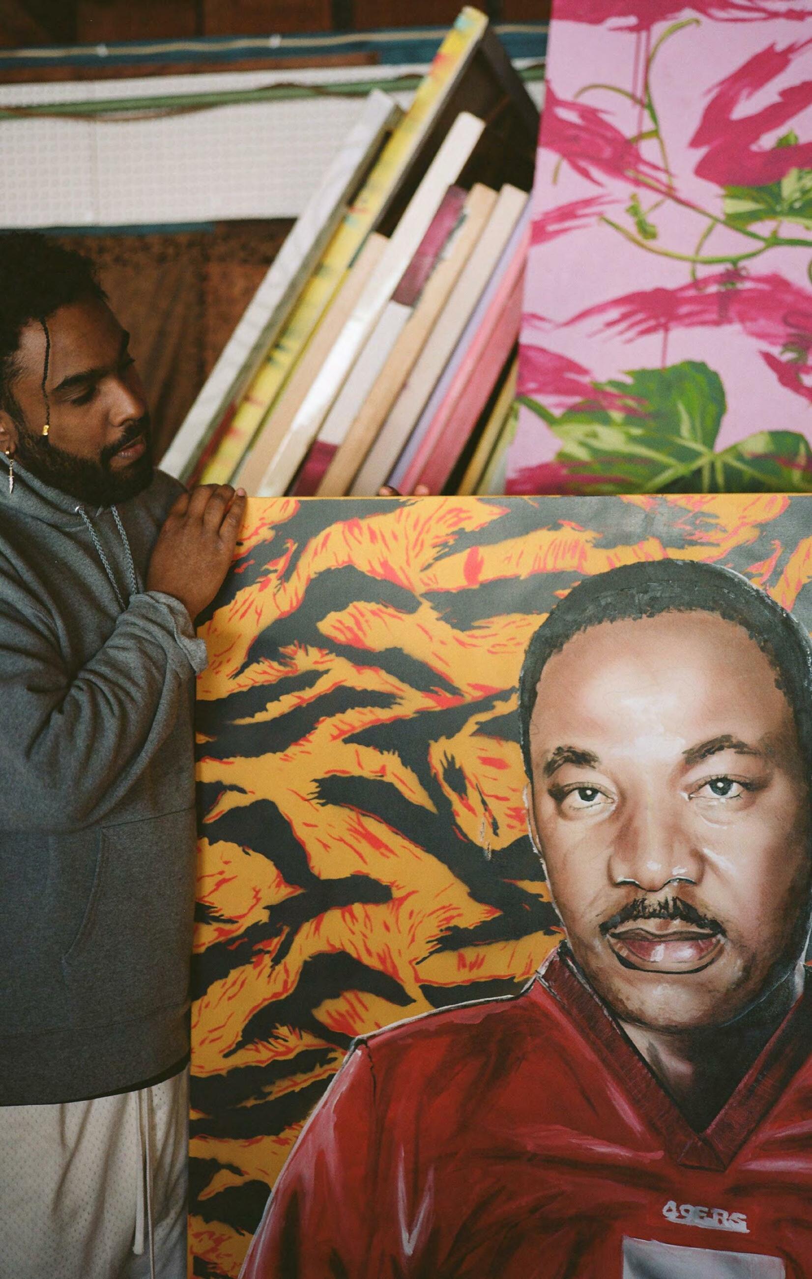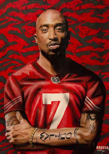 piece for that show, one was Tupac wearing a Kaepernick jersey, during the time when K aepernick took a knee. I did a piece of MLK as well, in a jersey using camouflage in the background. That was a big turning point for me, it was one of the biggest shows and was the first time I did a piece that big. I had two weeks, so I ended up doing a piece a week. At the show, they ended up not having any more wall space so they laid them against the wall, behind the DJ booth. I wasn’t pissed off or anything, but I was like, “This sucks.”