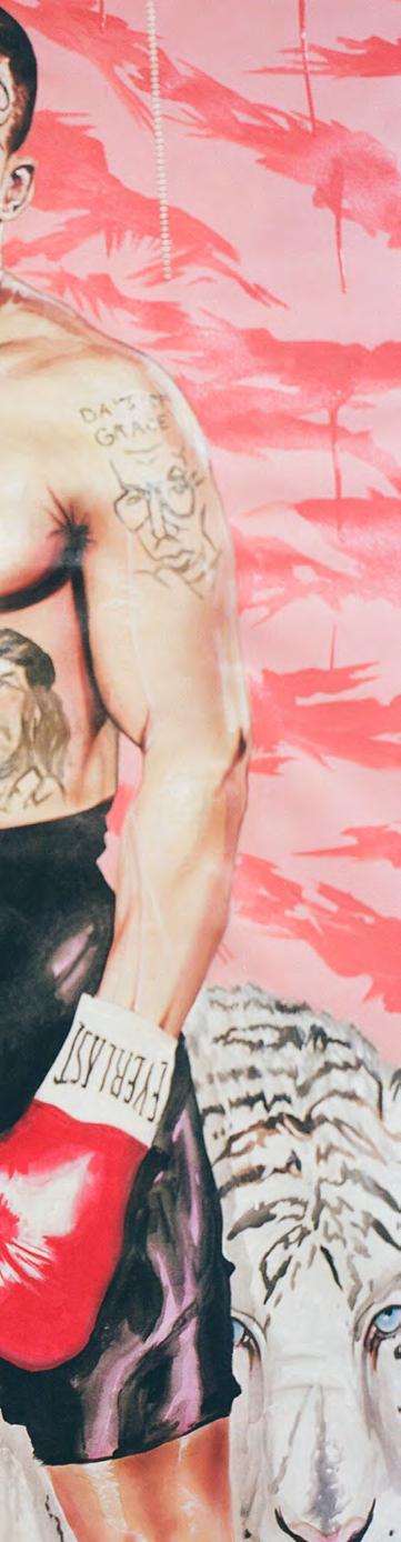 Actually, how I kind of got my style was taking my five favorite artists at the time and using what elements of theirs I liked the most. I thought, What messages do each of the artists teach me? What can I take from those elements and turn into my own? Andy Warhol did a series of camouflage paintings that I thought were really cool, so I started to mess with my own kind of version of that. Shepard Fairey was a top influence for me, he did some portraits of people that are very iconic and paints this stature that I admire. Banksy of course... I was looking at CRYPTIK and David Choe. James Jean is also a good one, I appreciated his tech nique and his different mediums, using many little elements in his pieces. Also the artist RETNA, I appreciated how simplistic and easy it is for him to make pieces and put stuff out. The quicker you can produce the better. Some guys take months and months to finish one piece. That’s not what I want to do. I could do that and paint super realistically but that’s what I appre ciate photography for. I don’t want my paintings to be photographs, a painting should be my own representation. When I started out, I was doing super-realism, enough that if you saw it online, you’d scroll past because you’d think it’s a picture. That’s something I had to switch up because I wanted to have a looser style. Something that’s loose enough that you’d know it’s a paint