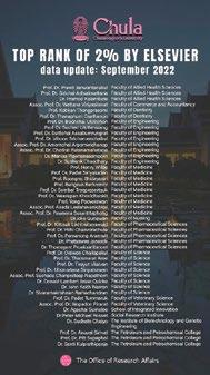 *Source: Office of Strategy Management and Budgeting, 2022 **Source: Office of Research Affairs, 2021 Faculty Academic Staff Total 3,040 4,956 7,996 Chula Personnel* Bachelor Master Doctoral Higher Graduate Diploma Graduate Diploma Total 28,457 8,855 3,059 829 62 41,262 Student Body* Research and Funding** Publication in Q1 Journal Scopus, 2021-2022 2126 Top 16 in the World by Time Higher Education World Impact Rankings 2022 Sustainable Development Goals for 704 projects Exchange rate: USD 1 = THB 34.46 (as of March 2023) Intramural Grants** $18.8 M for 495 projects Exchange rate: USD 1 = THB 34.46 (as of March 2023) Extramural Grants** $53.8 M Innovations 300+ Startups Under CU Innovation Hub, 2021 Under CU Innovation Hub, 2021 Market Value $45.3 M Academic Reputation No.1 in Thailand for the 14th consecutive year By QS World University Rankings (2021-2022)