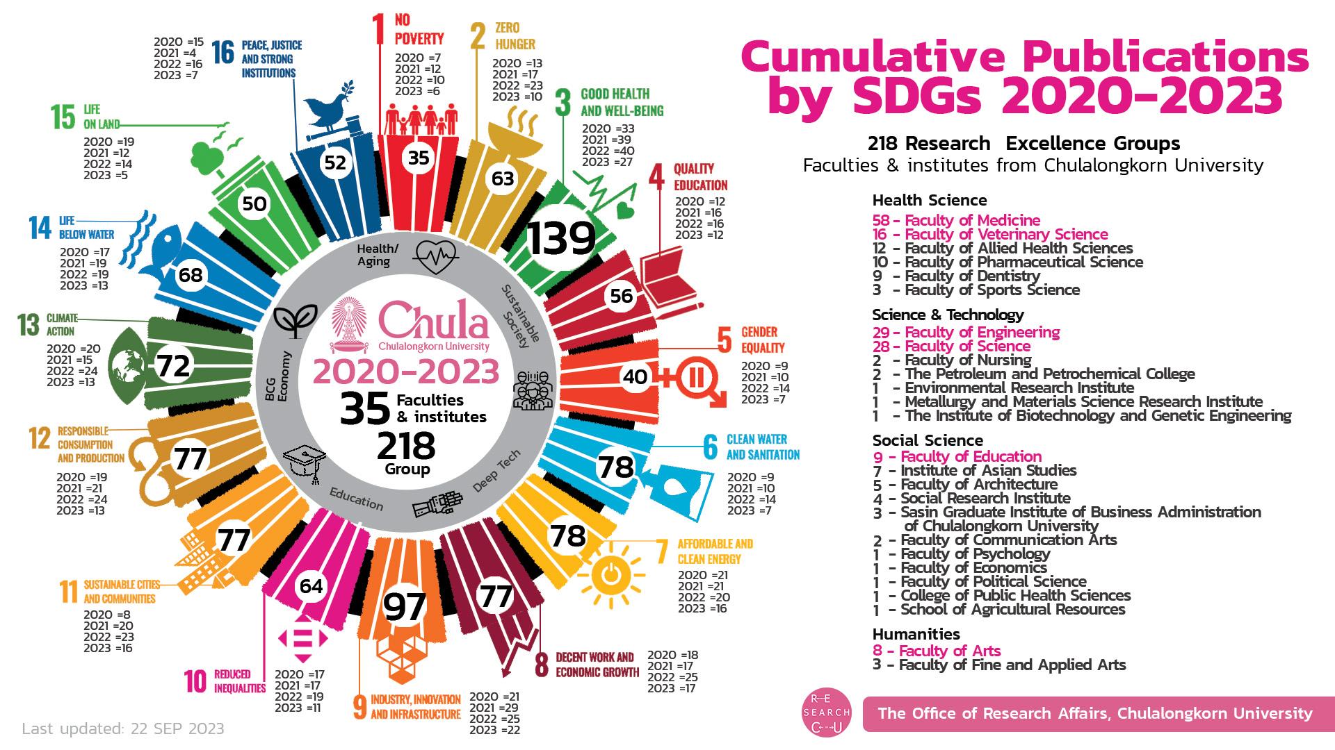 As of September 2023, Chulalongkorn University had formed 218 research groups or specialist centers with the ability to cover the four branches of science: Health Sciences, Technology, Social Sciences, and Humanities. The numerous contributions of these research groups and specialist centers align with the Sustainable Development Goals (SDGs).