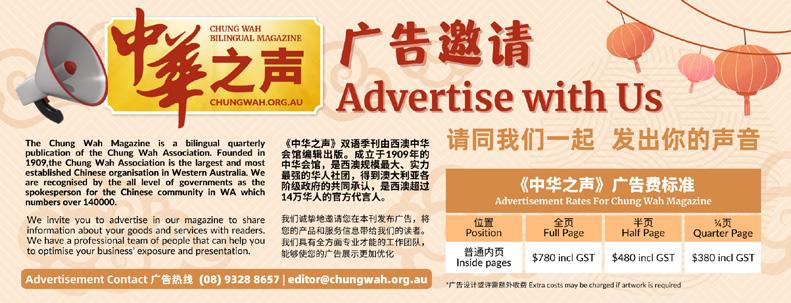 Are you curious about your fortune in 2024? We have prepared the Chinese Horoscope for your reference, however, you’re the master of your fortune. Sticky Rice Cake for the Lunar New Year is a must to have, you can learn to make it through our regular recipe section. Our Honorary Secretary, Jen Nie CHONG brings us an insight into the 2024 Chung Wah Chinese New Year events including the Perth Chinese New Year Fair at James Street, Northbridge and Yagan Square. The must-find details of the Dragon and Lion Dance performances, together with cultural activities at the shopping centres are available in this issue for your reference.