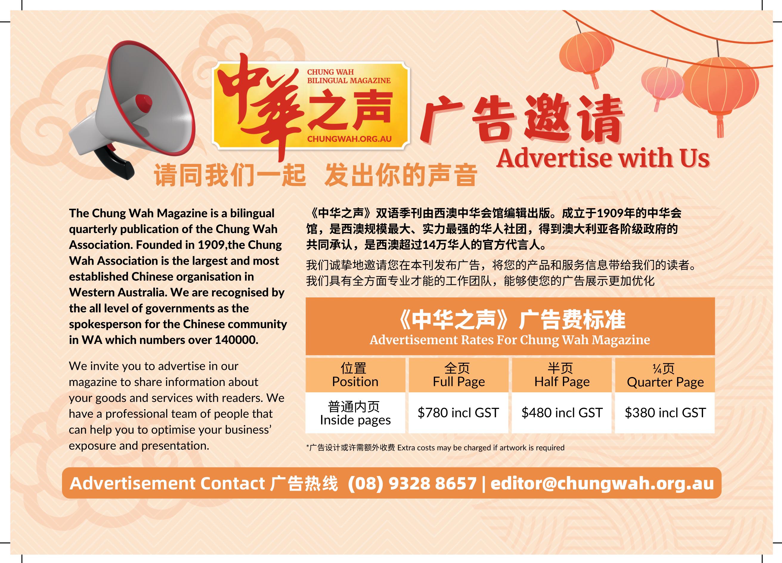 CHA 查绍翰 Chief Editor 主编Founded in 1909, the Chung Wah Association is the largest and most established Chinese organisation in Western Australia. We are recognised by the Federal, State, and Local Governments as the spokesperson for the Chinese community in Western Australia. The many achievements of the Association incude: