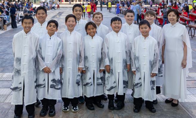 art of Taijiquan along with the rhythm of ‘The Fishing Boat Sings Evening’, which combined the image of Taijiquan kungfu with the sound of the historical guzheng music. This well illustrated the Oriental Philosophy of ‘The greatest truths are the simplest’ and ‘The greatest music has the faintest notes’, as well as the beauty of Chinese Ancient Culture! The adapted version of ‘So Many People in This World’, a very popular lyric song, was guided by the sound of guzheg and combined with the voice of children. The audiences were touched deeply by the beautiful melody. Then, the famous song ‘You & Me’ that was the theme song of the Beijing Summer Olympic Games and is well known among foreign friends. The performance of this song is to express our expectation for the friendship between China and Australia.