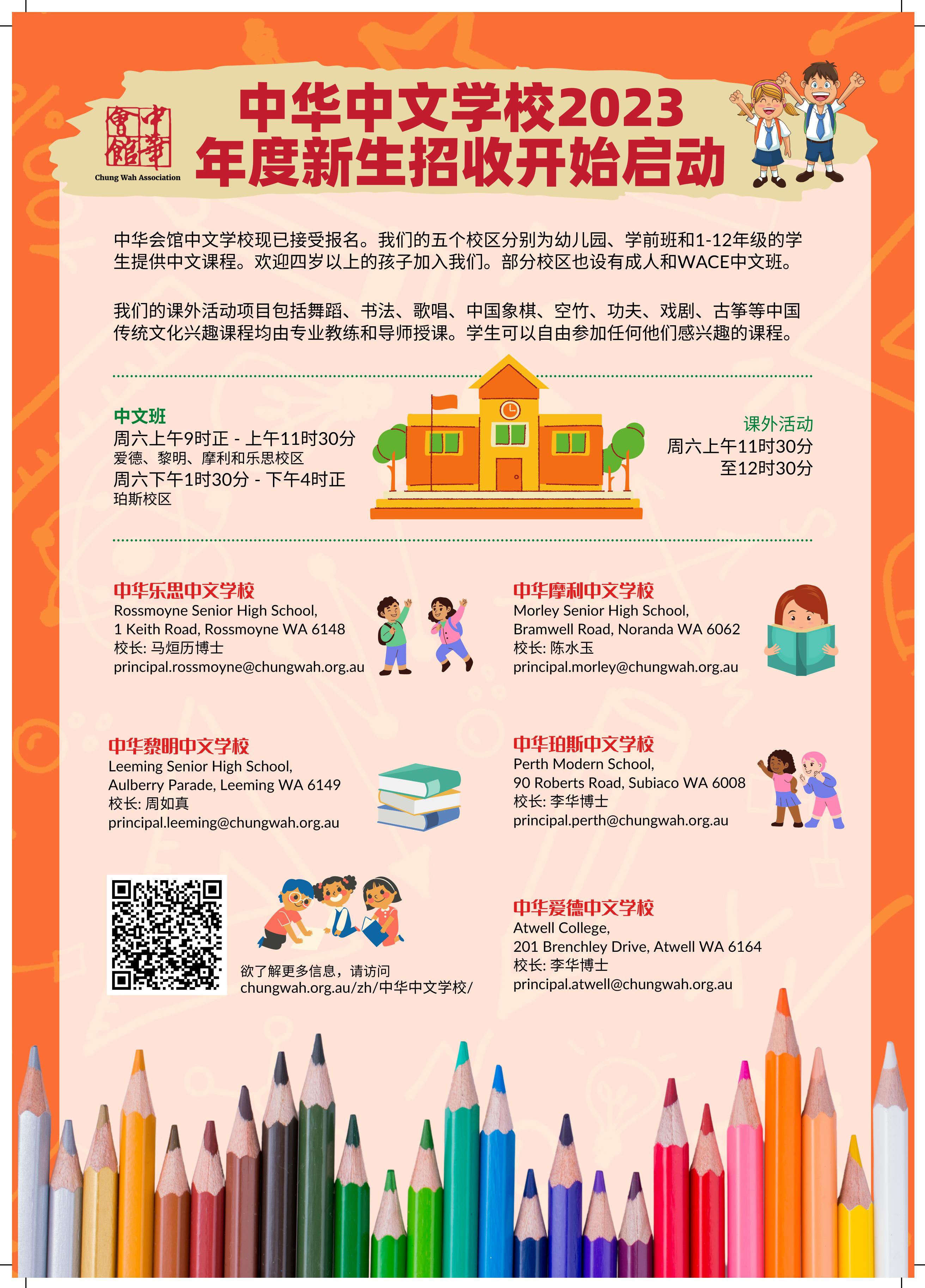 Enrolments are open for the new Chung Wah Chinese School year. Please refer to the advert in the Chung Wah Magazine for further details. Alternatively you may contact the respective schools.