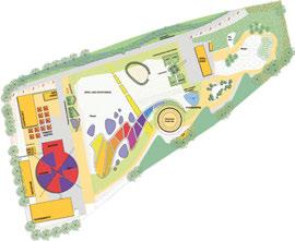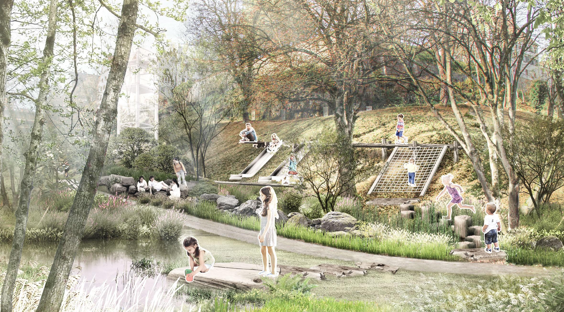 The huge height difference of the grass slope will be dissolved by abundant natural play facilities.