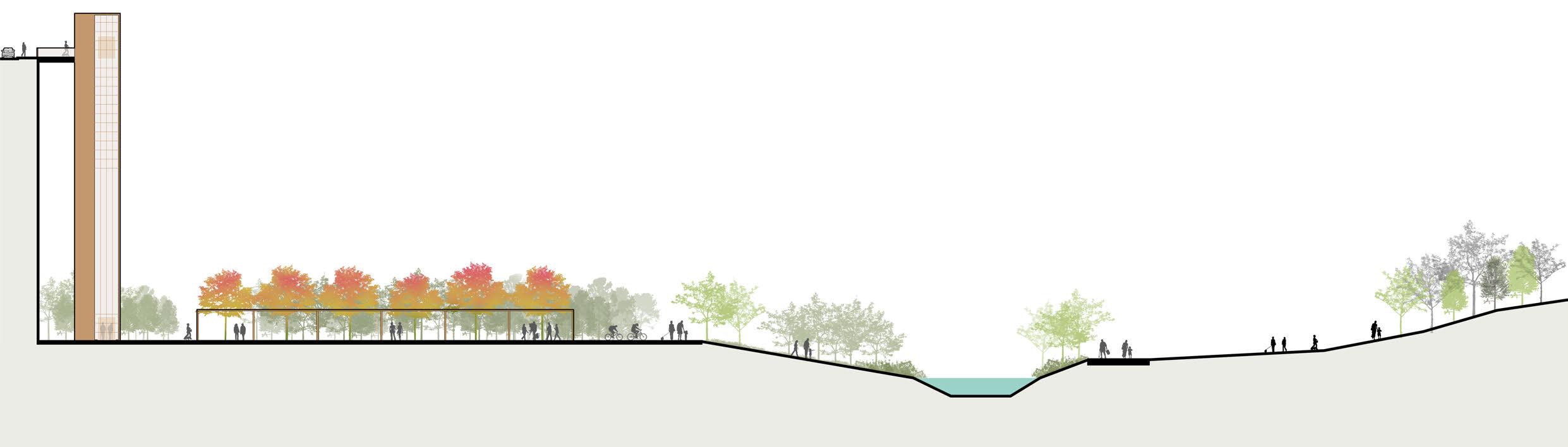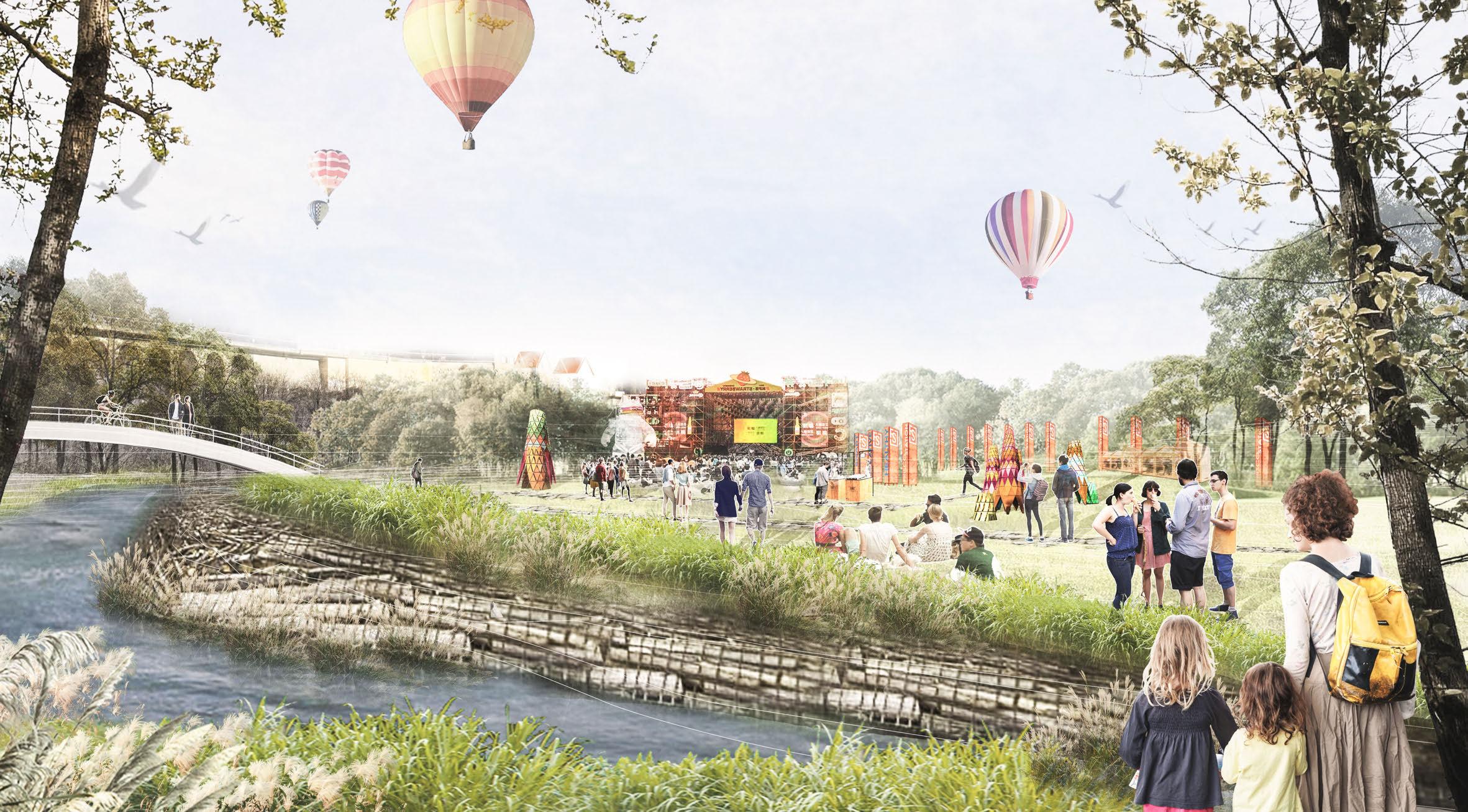 通过将整个内卡滨河体验区视作消纳动态水位的“蓝色容器’,该区域的泛洪结构将极大地增加洪水容 量,进而提升城市水韧性。平时,大型的活动,如音乐节,草坪市集,房车营地派对等将在这里举行。 当遭遇强烈降水时,该区域将转变为天然的蓄水池,充当自然的洪水缓冲区,降低洪水对周边的损害。