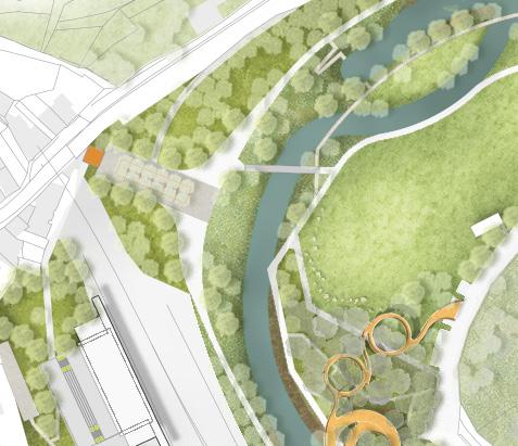 该区域设计原则以最大限度尊重原草坪的地形和植被为主旨,以内卡河的记忆为主题,选取在改造 过程中剩余的建筑石料(如水坝,或其他有历史价值的建筑),经排列组合的形式,打造草坪上的 大地艺术景观,为到访者打造一个开阔现代的,同时具有历史记忆感的参与式活动大草坪。同时, 结合不同的堤岸改造方式,在内卡河周边植入多样的亲水体验步道,增加河流的亲近感。 花架广场 滨河体验带 森林探索花园 岛屿花园 记忆大草坪