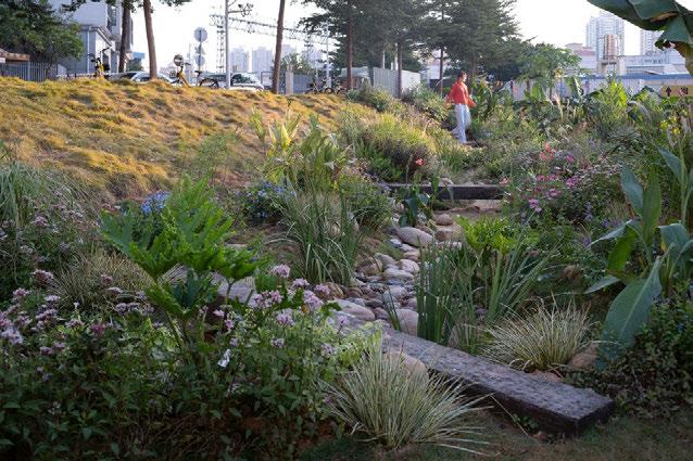 SUSTAINABILITY 交通系统 洪水韧性 生态保护 经济可持续 - 提出对业态体量和经济效益的建议 - 思考未来承办特色活动运营的可持续性 - 建立可持续的泛洪区结构 - 建立以自然护坡为主的河岸缓冲带 - 道路无障碍化 - 自行车友好 - 增加出入口对于周边社区的可达性 - 花园展期间的客流管控