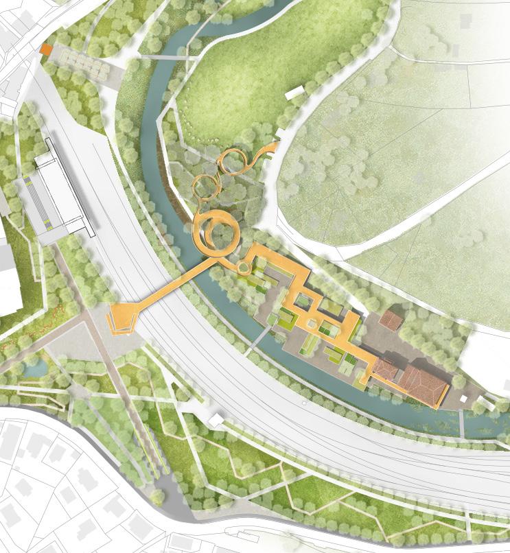 核心概念 CORE CONCEPT 呼应“Höher.Grüner.Weiter.”2028年州立园艺展的主题,本设计以“覆盖,连接,无界,跨越 双线的历史小镇花园”为小镇的整体规划理念,尊重原场地的历史和自然,局部覆盖新增功能 场地,用极具创意的LOOP环形景观桥体,连接东西两岸,老城和主展区,实现园艺展览在空 间上的“无界”概念。对穿越场地的内卡河提出“洁净,生命与活力”修复提升理念,通过一 系列符合场地自然环境的低成本方式,逐步恢复河道的自然生态和生物多样性,打造高品质的 活力滨水空间。以园艺展作为引擎,采用“长期营造”的策略及“微花园”模式,提升公众参性, 旨在整个罗特韦尔打造城一个大的“历史小镇花园” ,实现小镇整体经济升级。