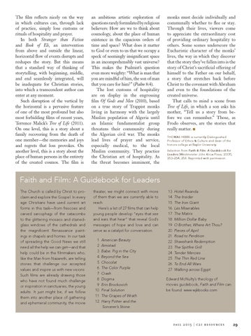 monks must decide individually and communally whether to flee or stay. Through their lives, viewers come to appreciate the extraordinary cost of providing ordinary hospitality to others. Some scenes underscore the Eucharistic character of the monks’ lives, the way in which they discover that the story they’ve fallen into is the story of Christ’s sacrificial offering of himself to the Father on our behalf, a story that stretches back before Christ to the covenant with Abraham and even to the foundations of the created universe. That calls to mind a scene from Tree of Life, in which a son asks his mother, “Tell us a story from before we can remember.” Those, as Frodo observes, are the stories that really matter. ■ THOMAS HIBBS is currently Distinguished Professor of Ethics & Culture and dean of the honors college at Baylor University. Selection from Faith & Film: A Guidebook for Leaders (Westminster John Knox Press, 2007), 253–254, 256. Reprinted with permission.