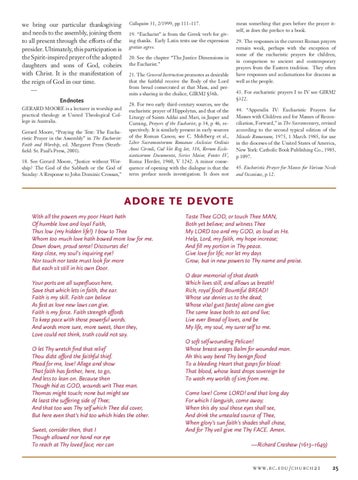 Colloquim 31, 2/1999, pp 111–117. 19. “Eucharist” is from the Greek verb for giving thanks. Early Latin texts use the expression gratias agree. 20. See the chapter “The Justice Dimensions in the Eucharist.” 21. The General Instruction promotes as desirable that the faithful receive the Body of the Lord from bread consecrated at that Mass, and permits a sharing in the chalice, GIRM2 §56h. 28. For two early third-century sources, see the eucharistic prayer of Hippolytus, and that of the Liturgy of Saints Addai and Mari, in Jasper and Cuming, Prayers of the Eucharist, p 34, p 46, respectively. It is similarly present in early sources of the Roman Canon; see C. Mohlberg et al., Liber Sacramentorum Romanae Aeclesiae Ordinis Anni Circuli, Cod Vat Reg lat, 316, Rerum Ecclesiasticarum Documenta, Series Maior, Fontes IV, Roma: Herder, 1960, V 1242. A minor consequence of opening with the dialogue is that the term preface needs investigation. It does not