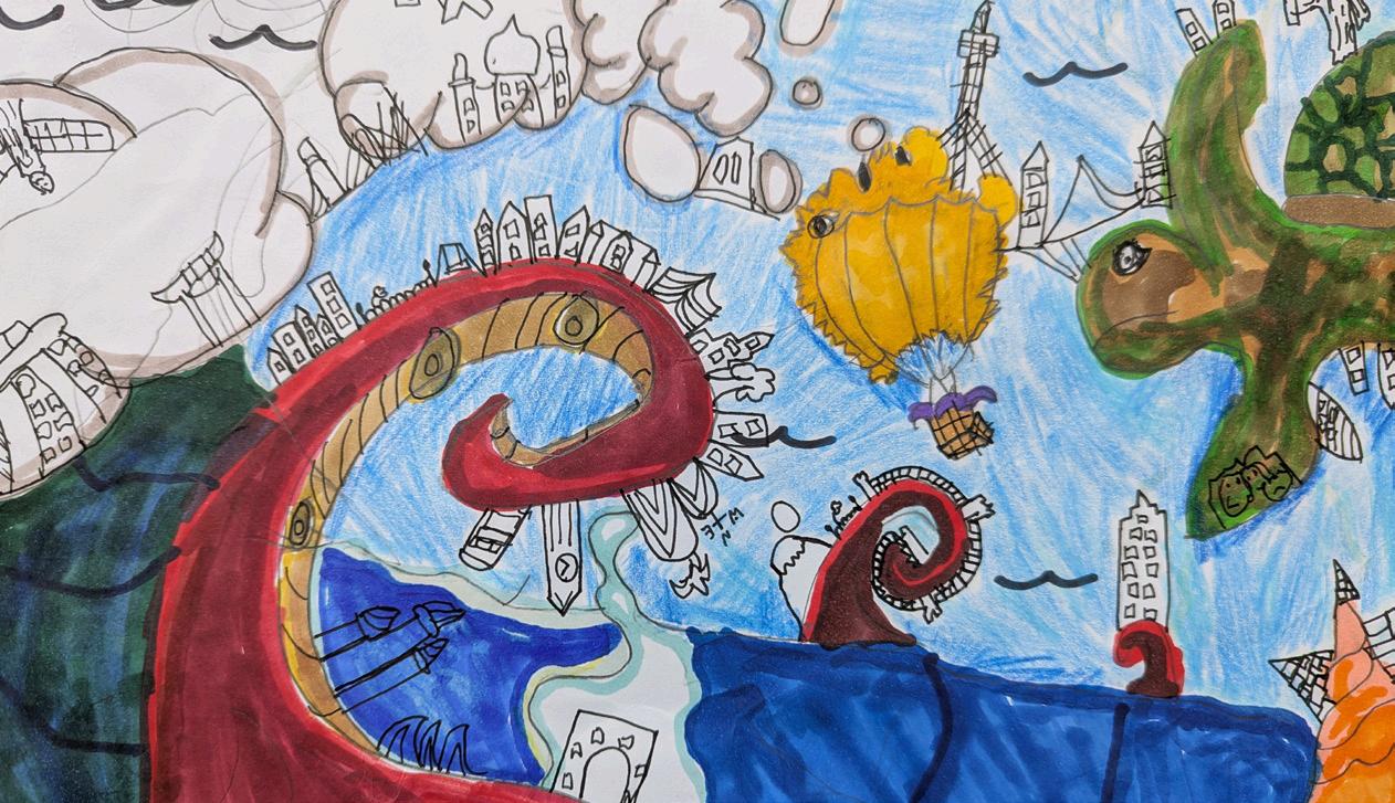 included cam toys and an imaginative newspaper fashion challenge. Year 6 combined creativity with technology, making laser-cut clocks and sublimation-printed lanterns linked to science. Artistic studies ranged from Georgia O’Keeffe and Aboriginal art, to Victorian samplers and storybased illustrations, inspired by David Wiesner’s Flotsam.
