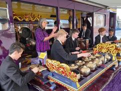 As part of the A Level Music enrichment programme, our Sixth Form students have attended two events this term. The first involved a purple and gold 1967 vintage doubledecker bus called Gertrude, parked outside the Science Department! Onboard was an Indonesian Gamelan – a collection of gongs, metallophones, xylophones and drums laid out on beautifully carved frames. After respectfully removing their shoes and carefully avoiding any stepping over the instruments, the students enjoyed a hands-on experience playing various layered ostinati and cyclic melodies – much to the enjoyment of passing students. The second event was a conducting masterclass which aimed to give the students some basic conducting skills. Visiting professional conductor Russell Keable led an entertaining session in which students demonstrated varying degrees of coordination as they attempted to conduct each other in a range of time signatures. As they soon discovered, conducting is a lot harder than it looks!