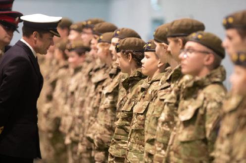 for three well-executed section battle drill demonstrations by the Army on Memorial Field. For the remainder of the afternoon the RO and guests toured a broad range of training activities around the school site: the Royal Navy showcased field gun and limber drills and maritime ropework on the parade square, the RAF demonstrated teamwork through blindfold drone piloting in the gym and the Army exhibited training in advanced drill movements and patrolling in the grounds.
