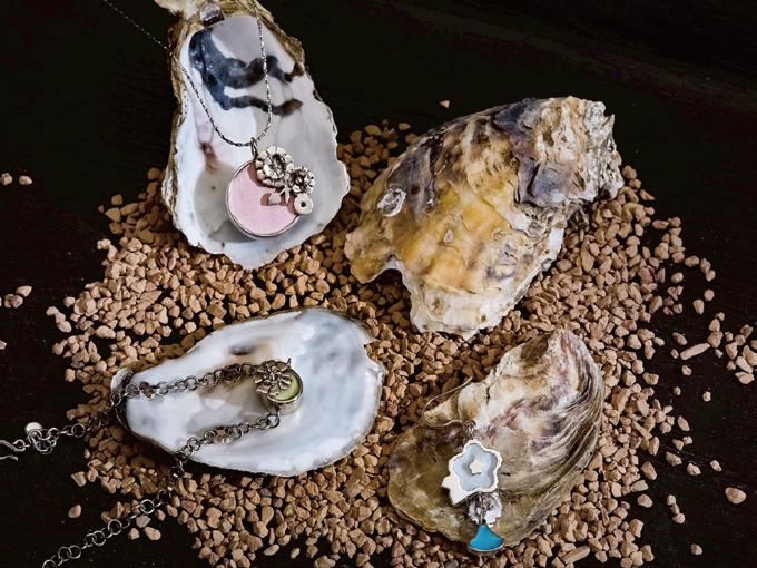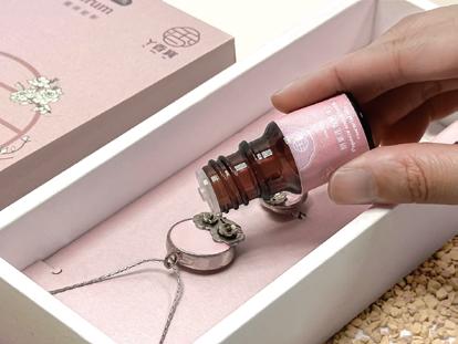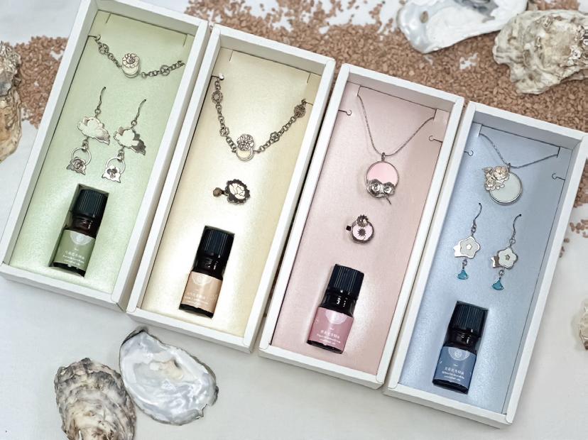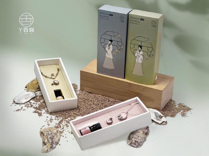 「丫香寶香氛飾品」以《紅樓夢》女性意象為發想, 飾品設計結合銀器的美與擴香石的芳香,融入環保概念, 擴香石採用廢棄蚵殼粉製成,有循環再利用並象徵自然與 情感流動。