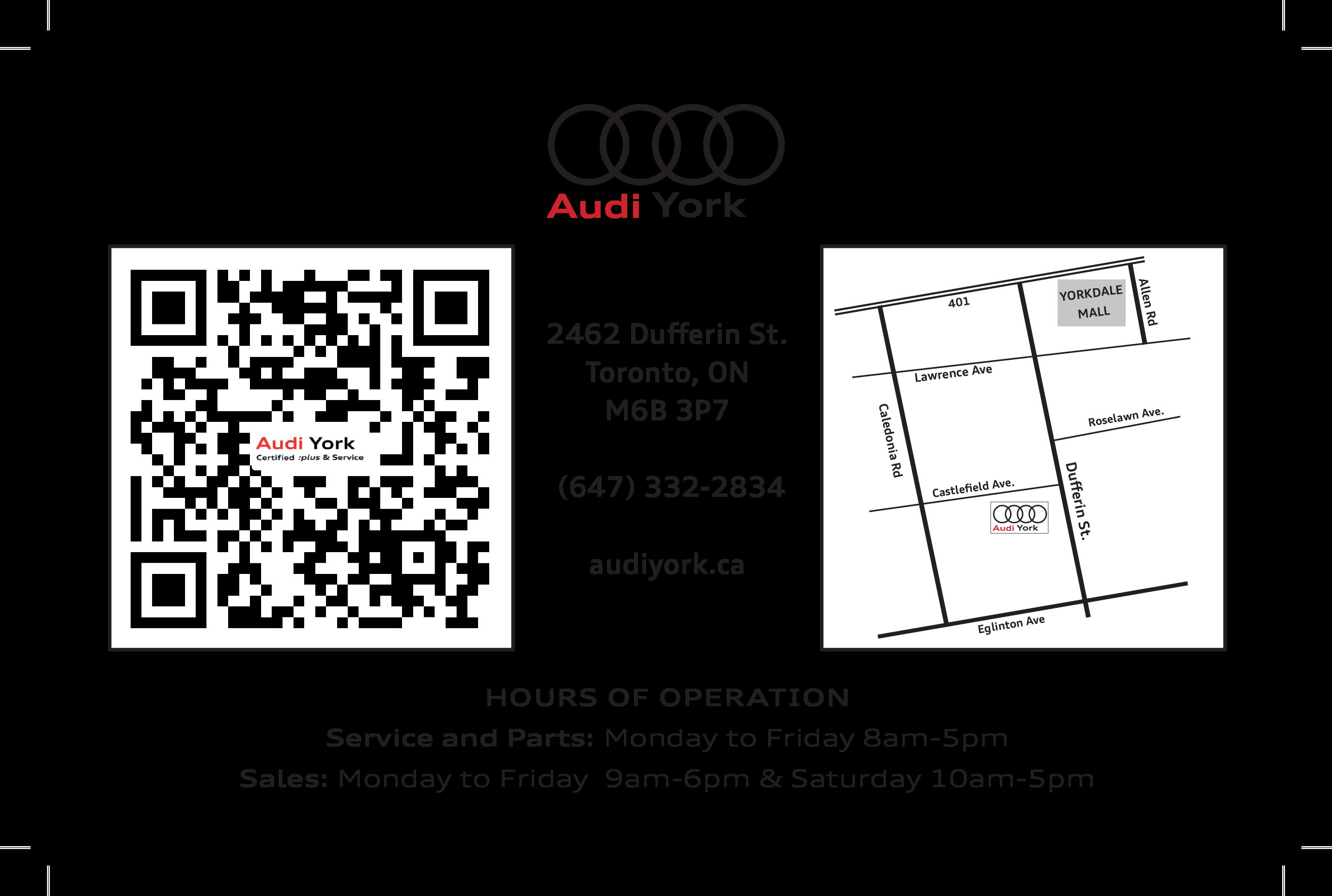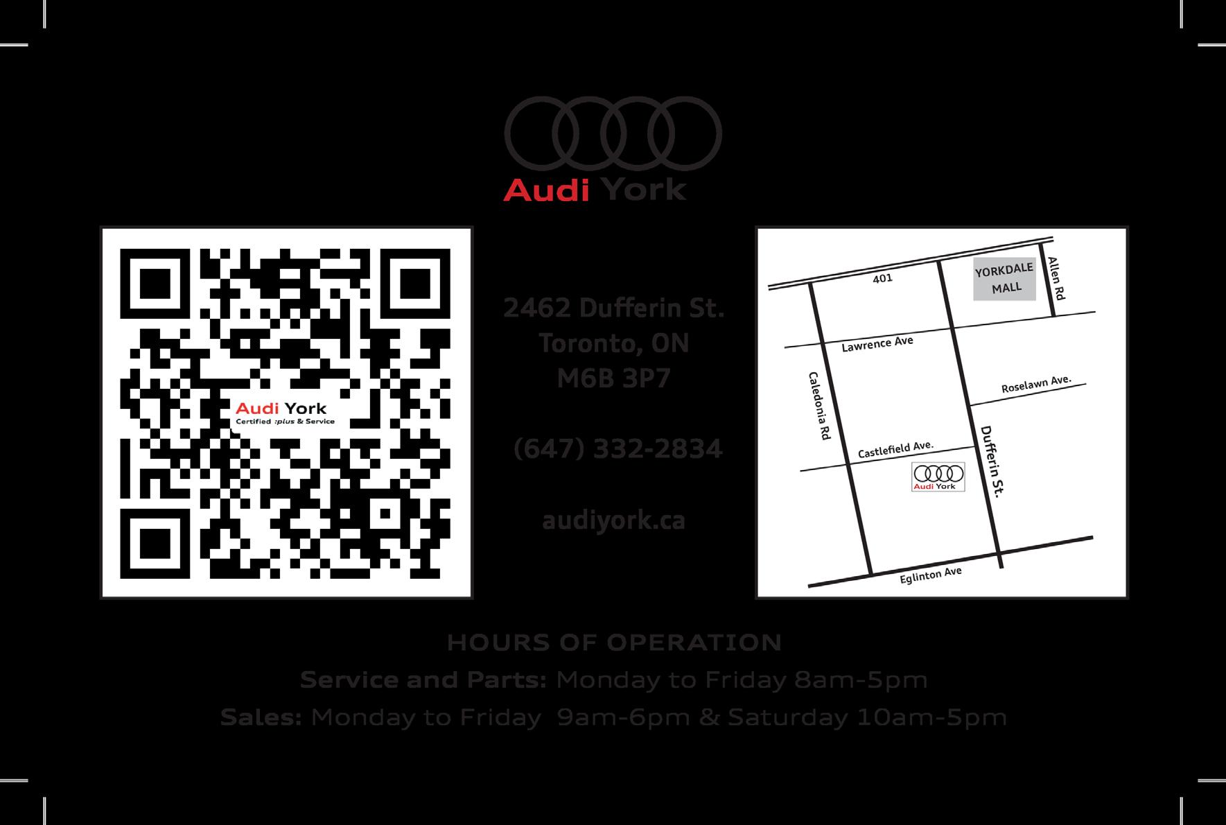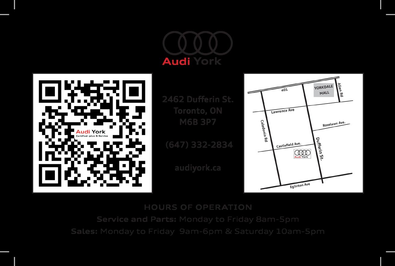 Your new companion Your neighbourhood and GTA’s newest Audi dealer 2462 Dufferin St. Toronto, ON M6B 3P7 South of Yorkdale Shopping Centre HOURS OF OPERATION Monday to Friday 8am-5pm Sales: & Saturday 10am-5pm to Friday 9am-6pm Service and Parts: Monday (647) 332-2834 | www.audiyork.ca