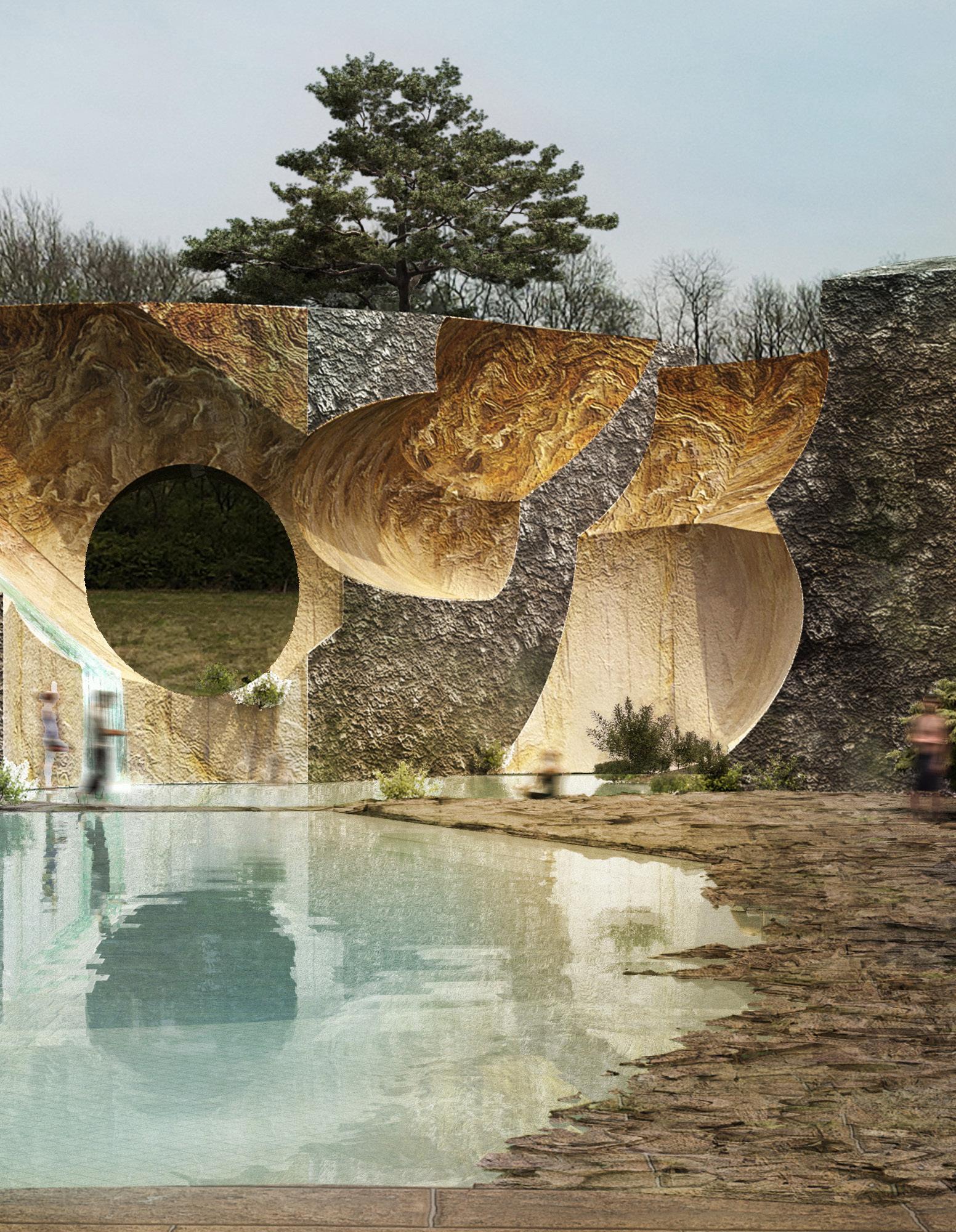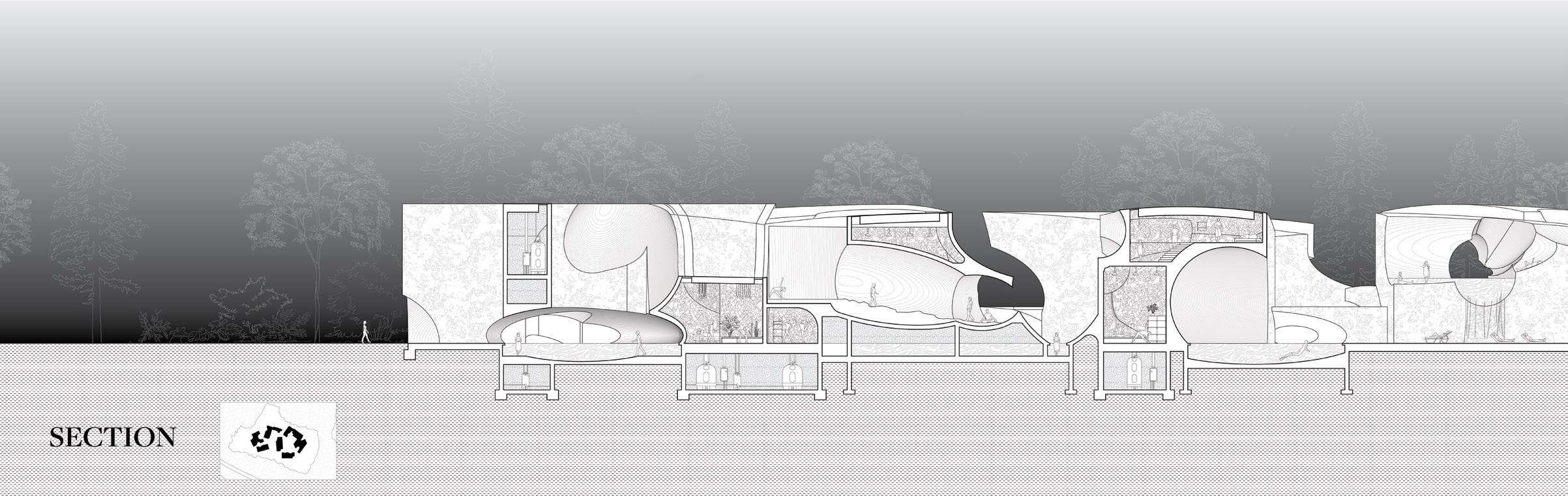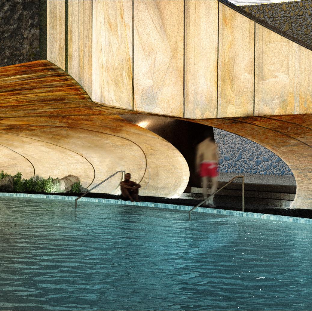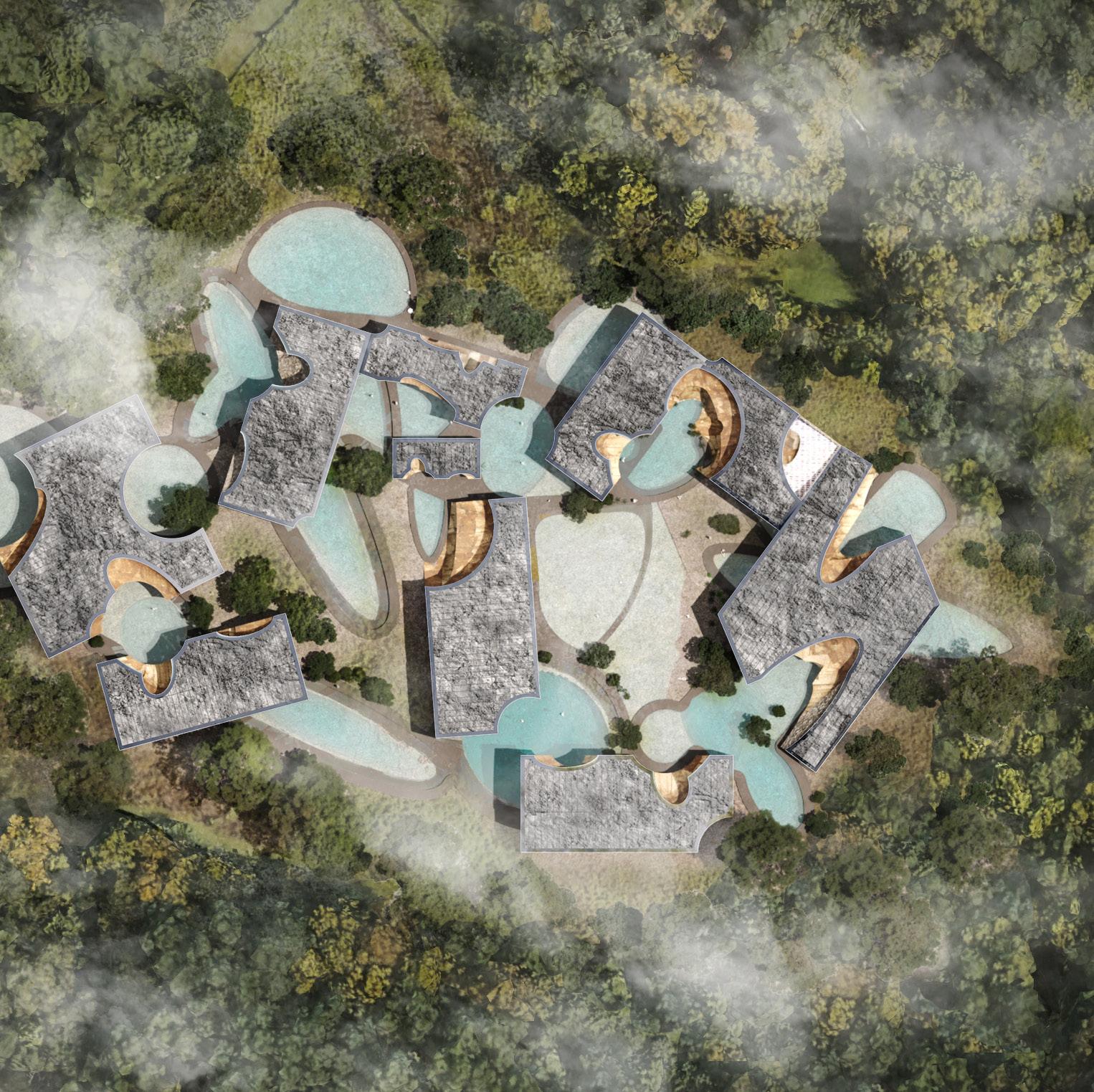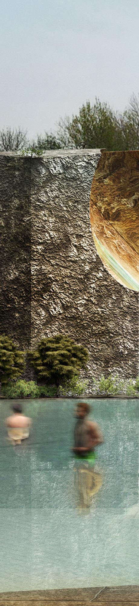 To address the prompts of the bathhouse program as well as the ideas of gender/sex fluidity alongside the ruinous and the picturesque, we try to break the idea of an "ideal". The form providing a wide variety of pools and spaces, and materiality introducing "imperfect" features like weathering and moss, along with "welcome" features like trees and plants in between gaps. We don't impose an ideal mindset; we just enable the possibility of many mindsets. We thus allow people to flow between these mindsets via the connectivity of the pools.