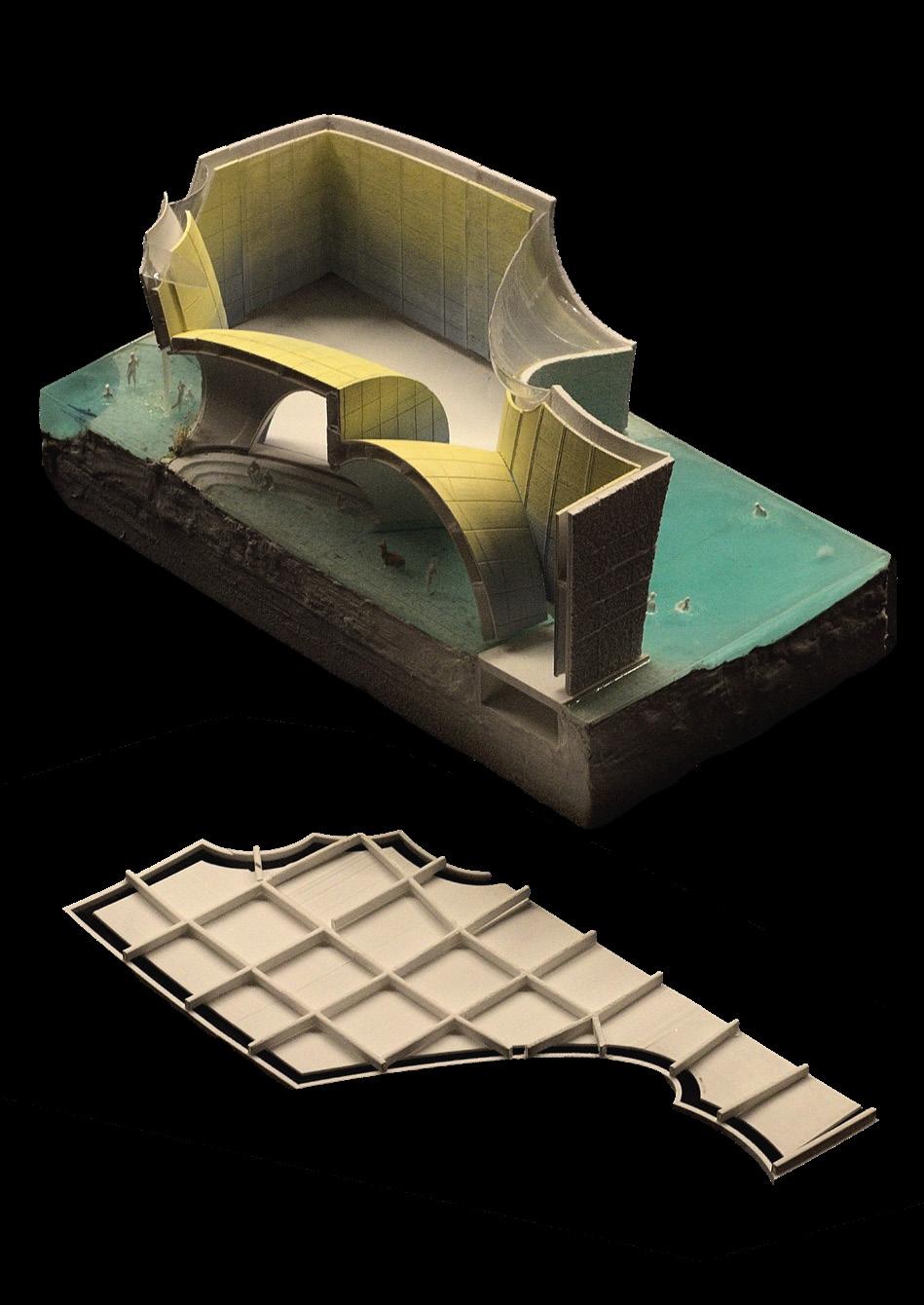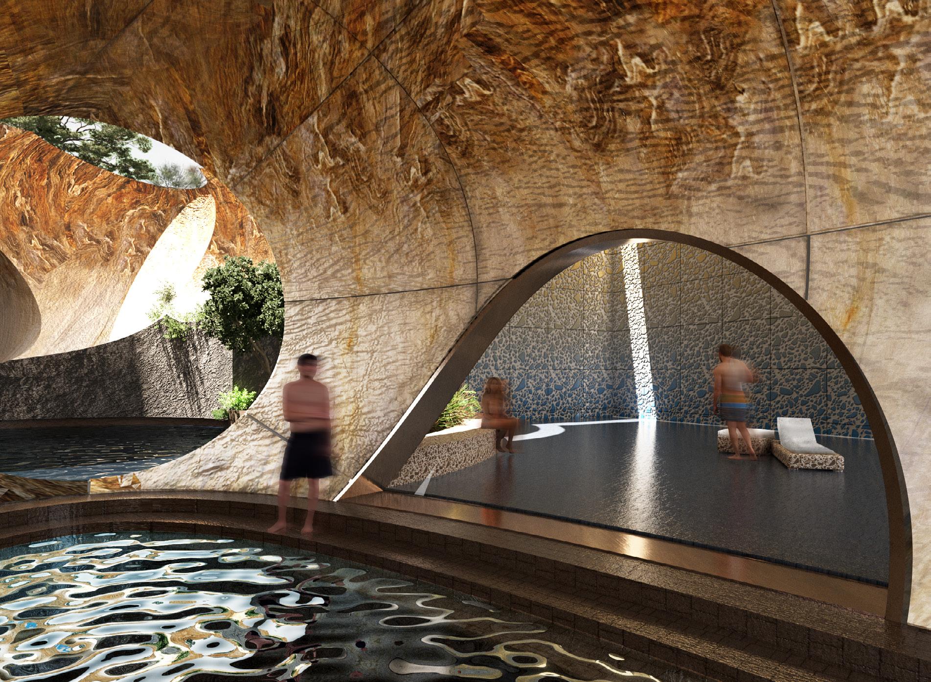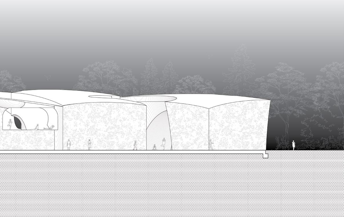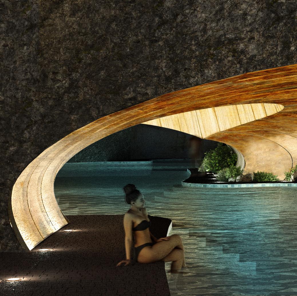 To address the prompts of the bathhouse program as well as the ideas of gender/sex fluidity alongside the ruinous and the picturesque, we try to break the idea of an "ideal". The form providing a wide variety of pools and spaces, and materiality introducing "imperfect" features like weathering and moss, along with "welcome" features like trees and plants in between gaps. We don't impose an ideal mindset; we just enable the possibility of many mindsets. We thus allow people to flow between these mindsets via the connectivity of the pools.
