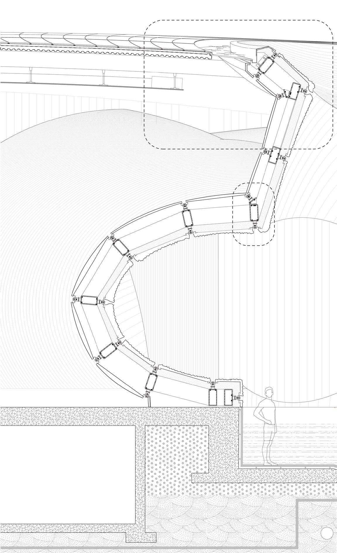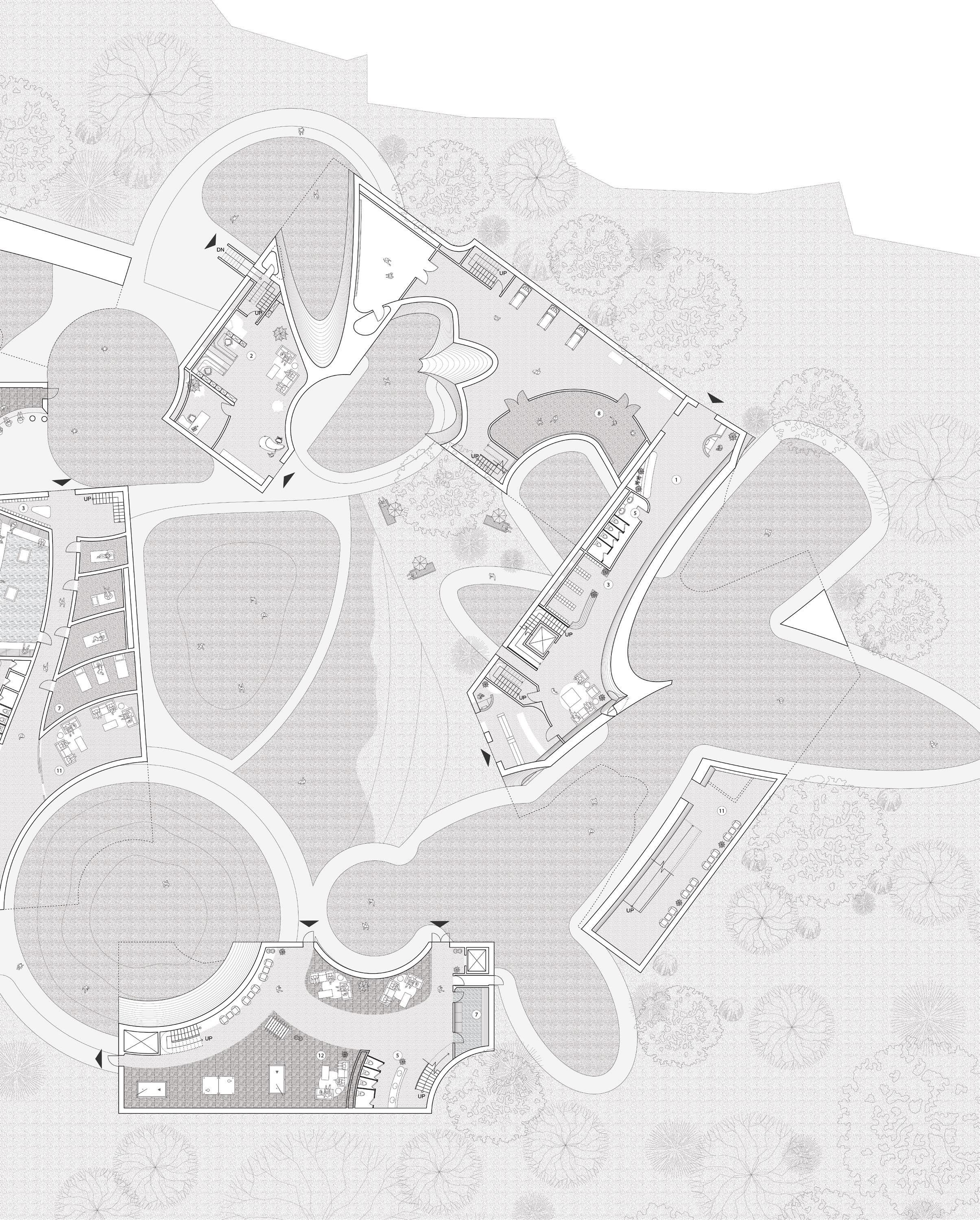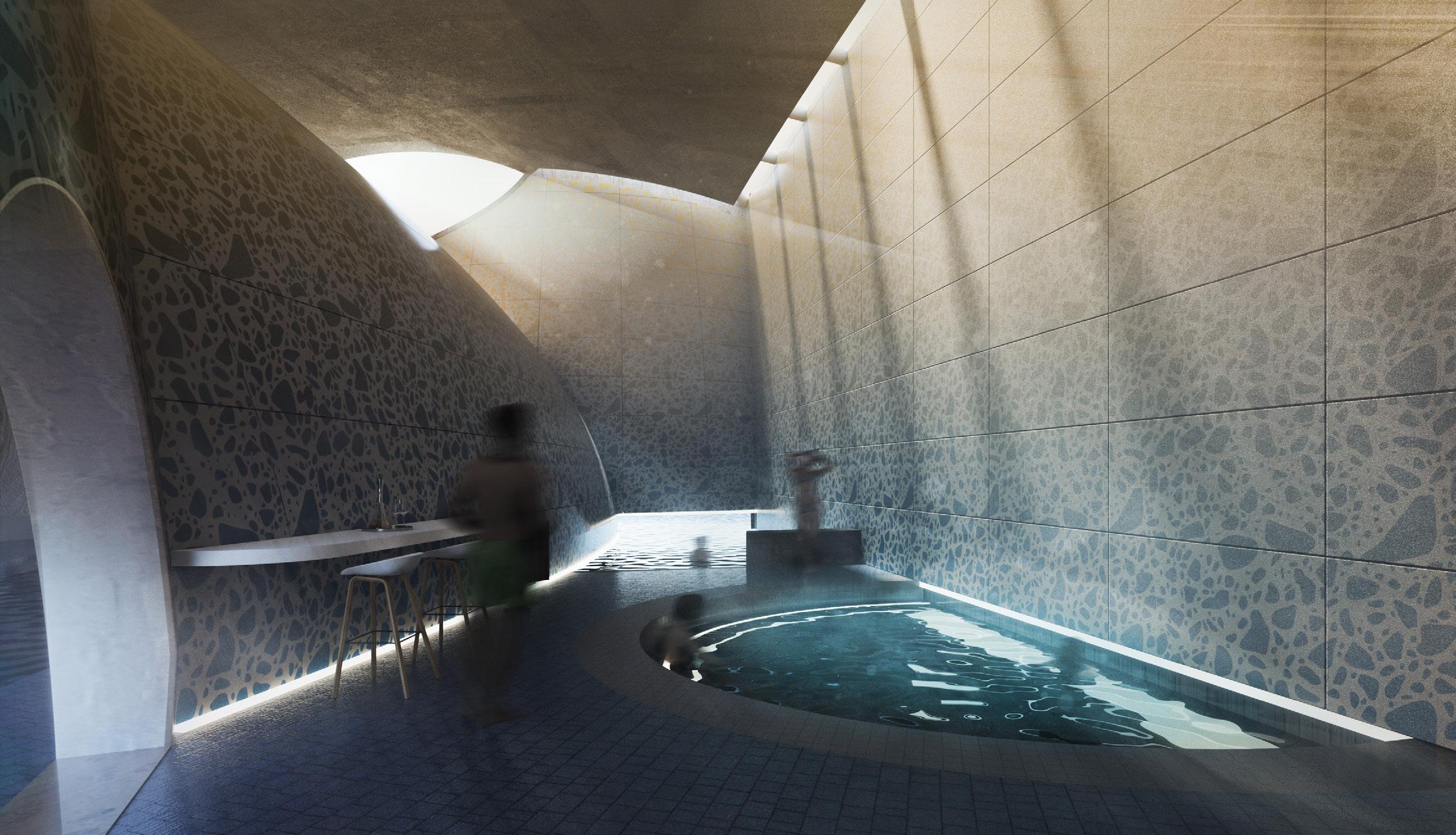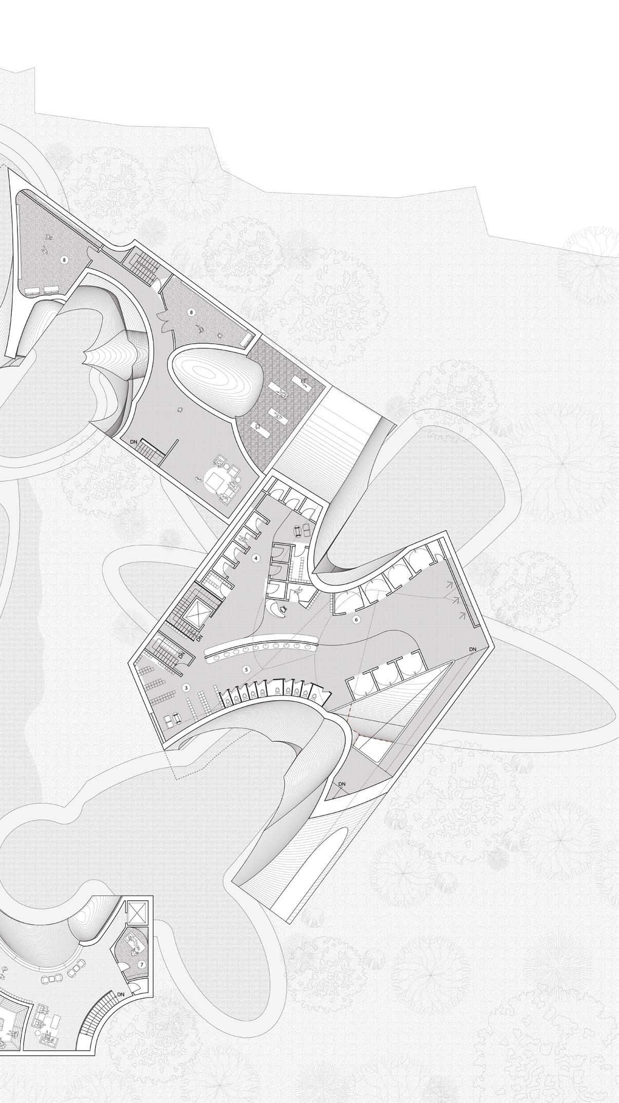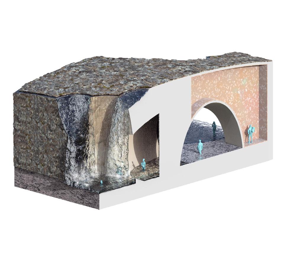 To address the prompts of the bathhouse program as well as the ideas of gender/sex fluidity alongside the ruinous and the picturesque, we try to break the idea of an "ideal". The form providing a wide variety of pools and spaces, and materiality introducing "imperfect" features like weathering and moss, along with "welcome" features like trees and plants in between gaps. We don't impose an ideal mindset; we just enable the possibility of many mindsets. We thus allow people to flow between these mindsets via the connectivity of the pools.