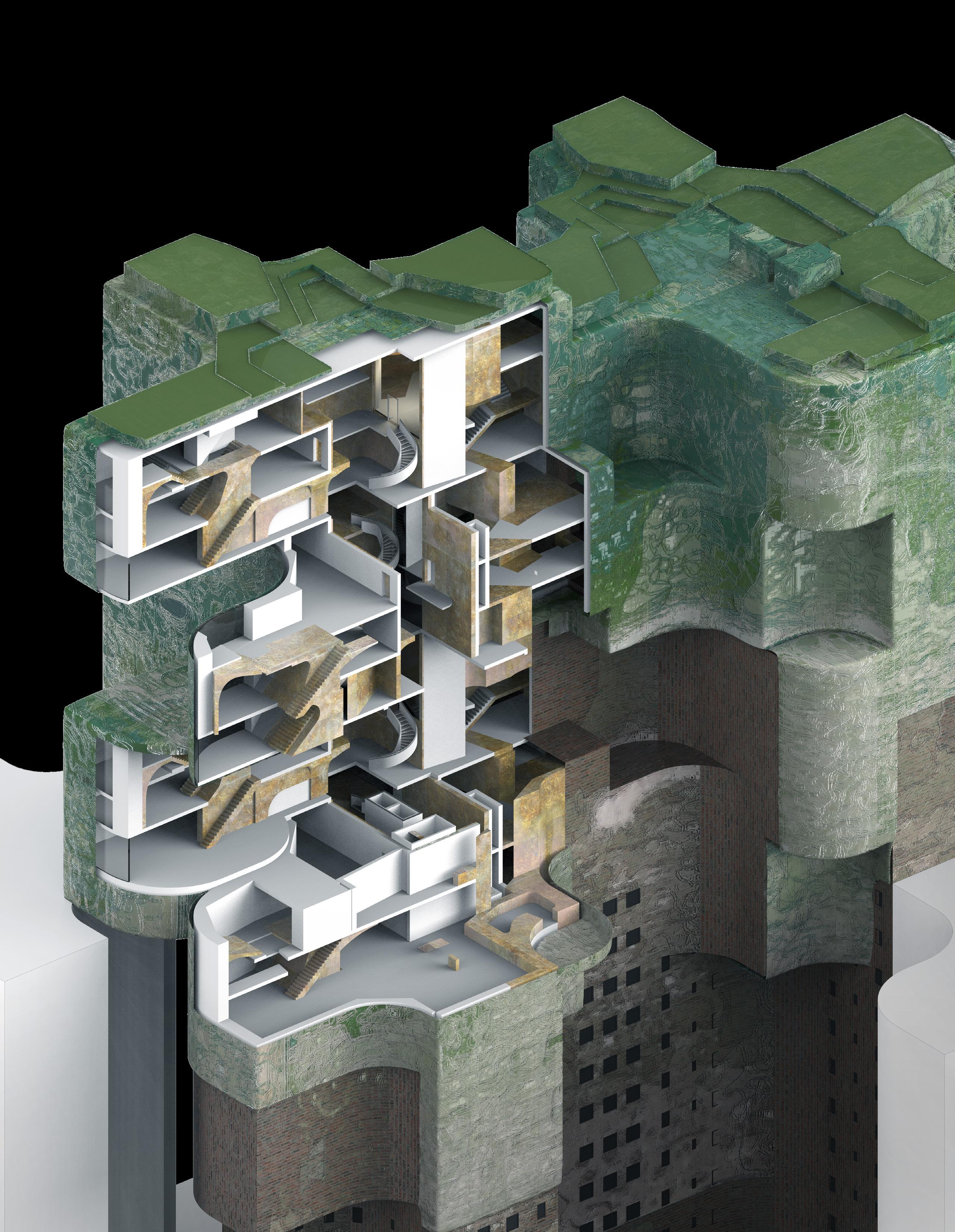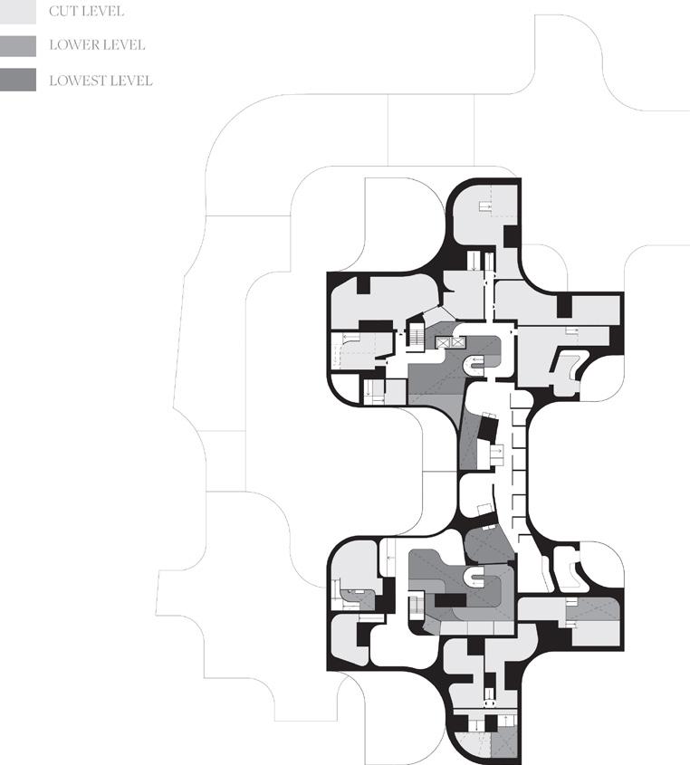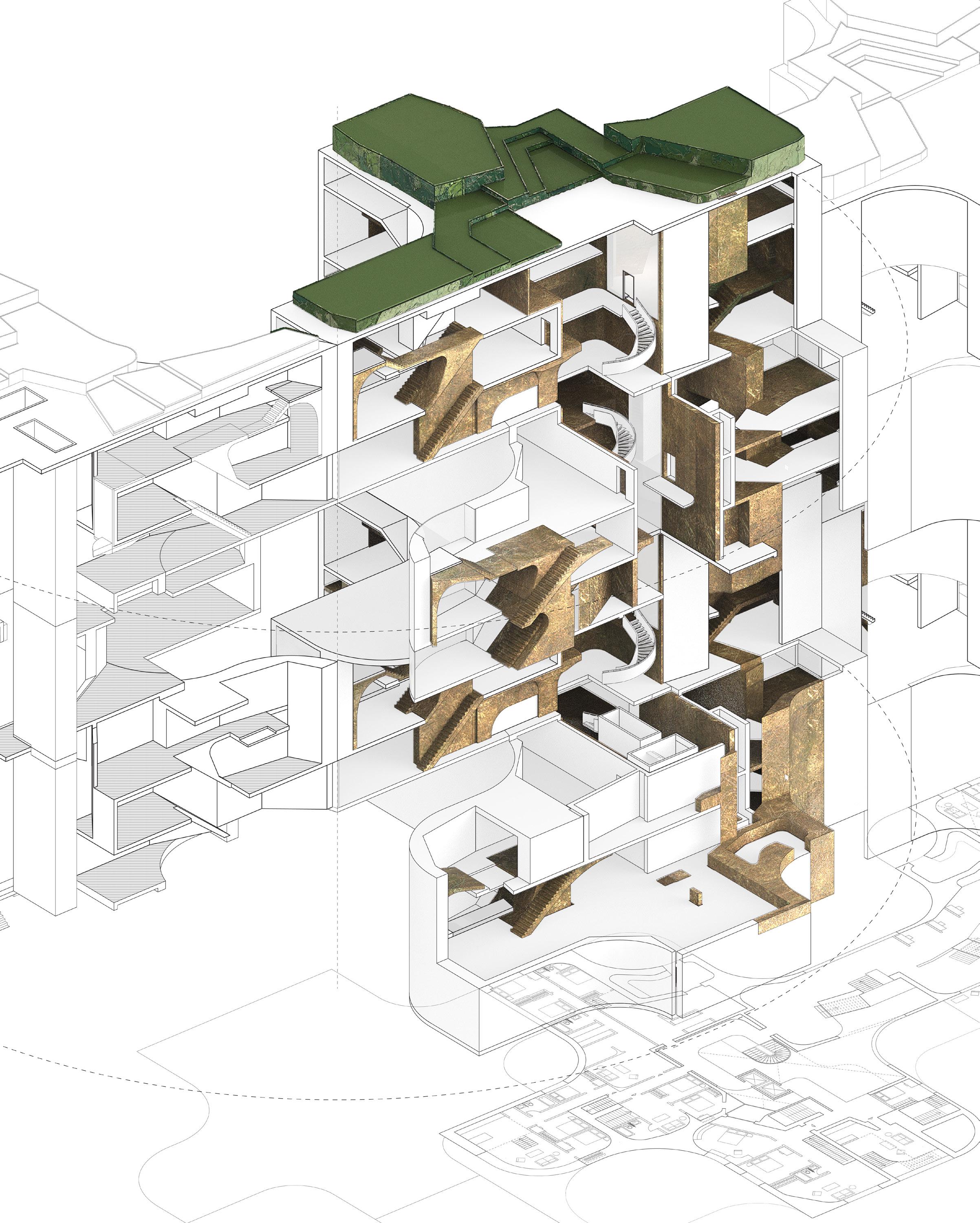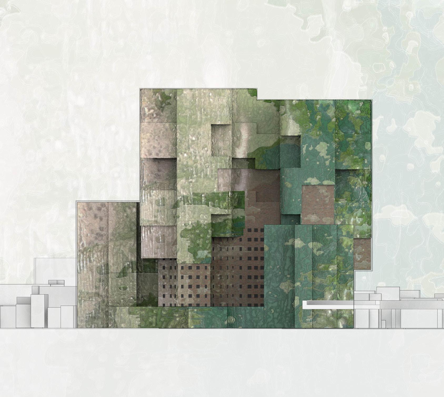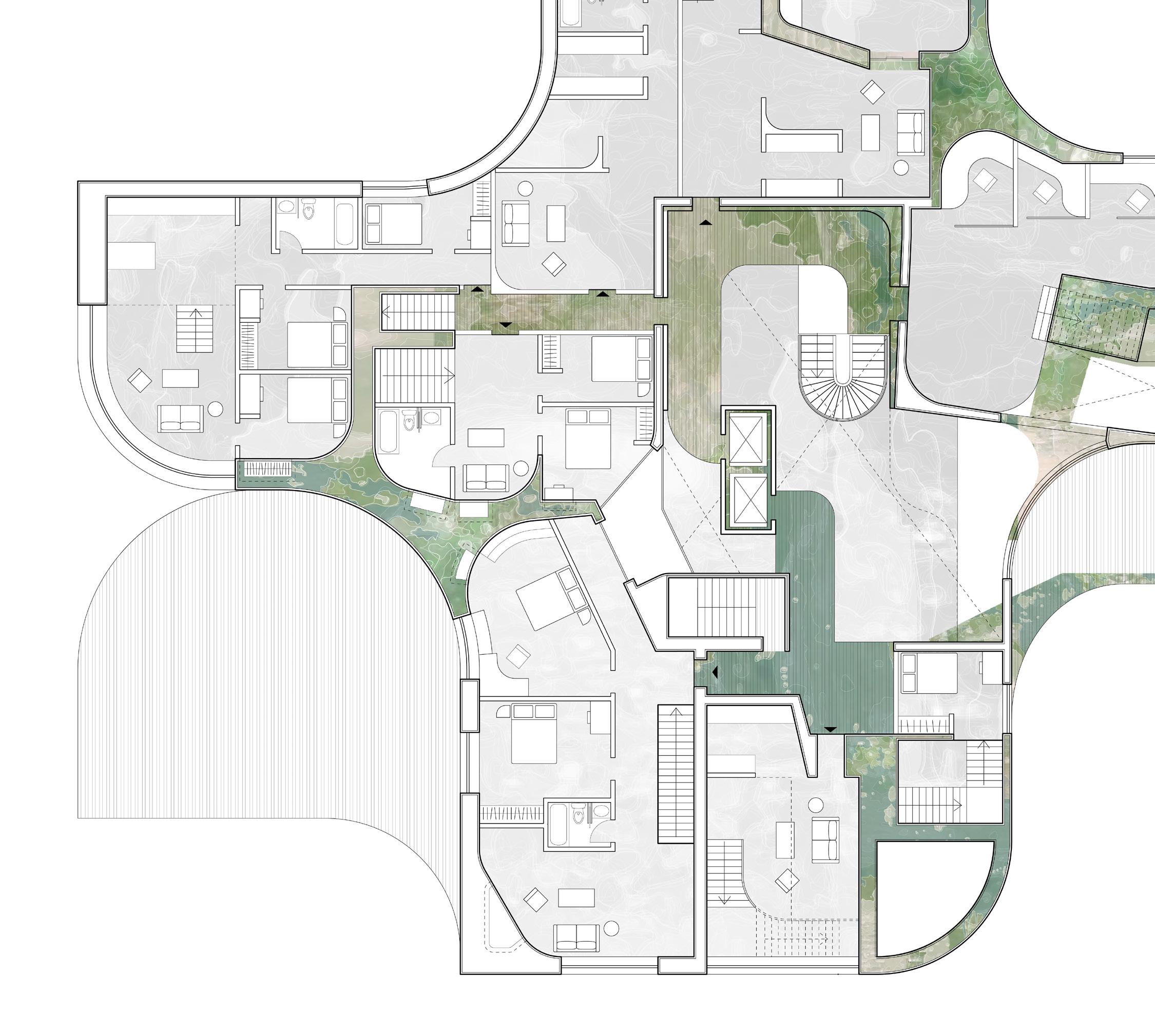 To address the prompts of the bathhouse program as well as the ideas of gender/sex fluidity alongside the ruinous and the picturesque, we try to break the idea of an "ideal". The form providing a wide variety of pools and spaces, and materiality introducing "imperfect" features like weathering and moss, along with "welcome" features like trees and plants in between gaps. We don't impose an ideal mindset; we just enable the possibility of many mindsets. We thus allow people to flow between these mindsets via the connectivity of the pools.