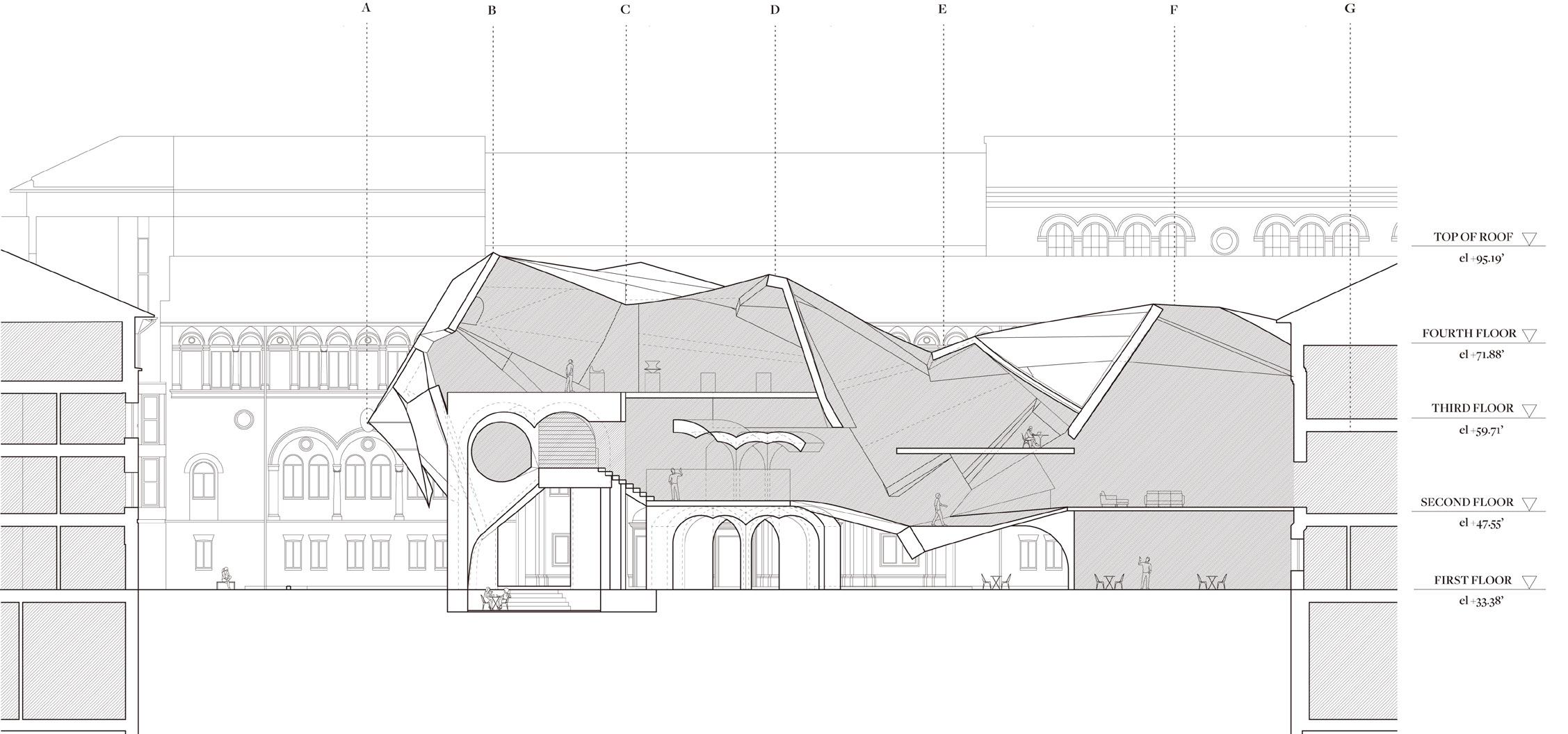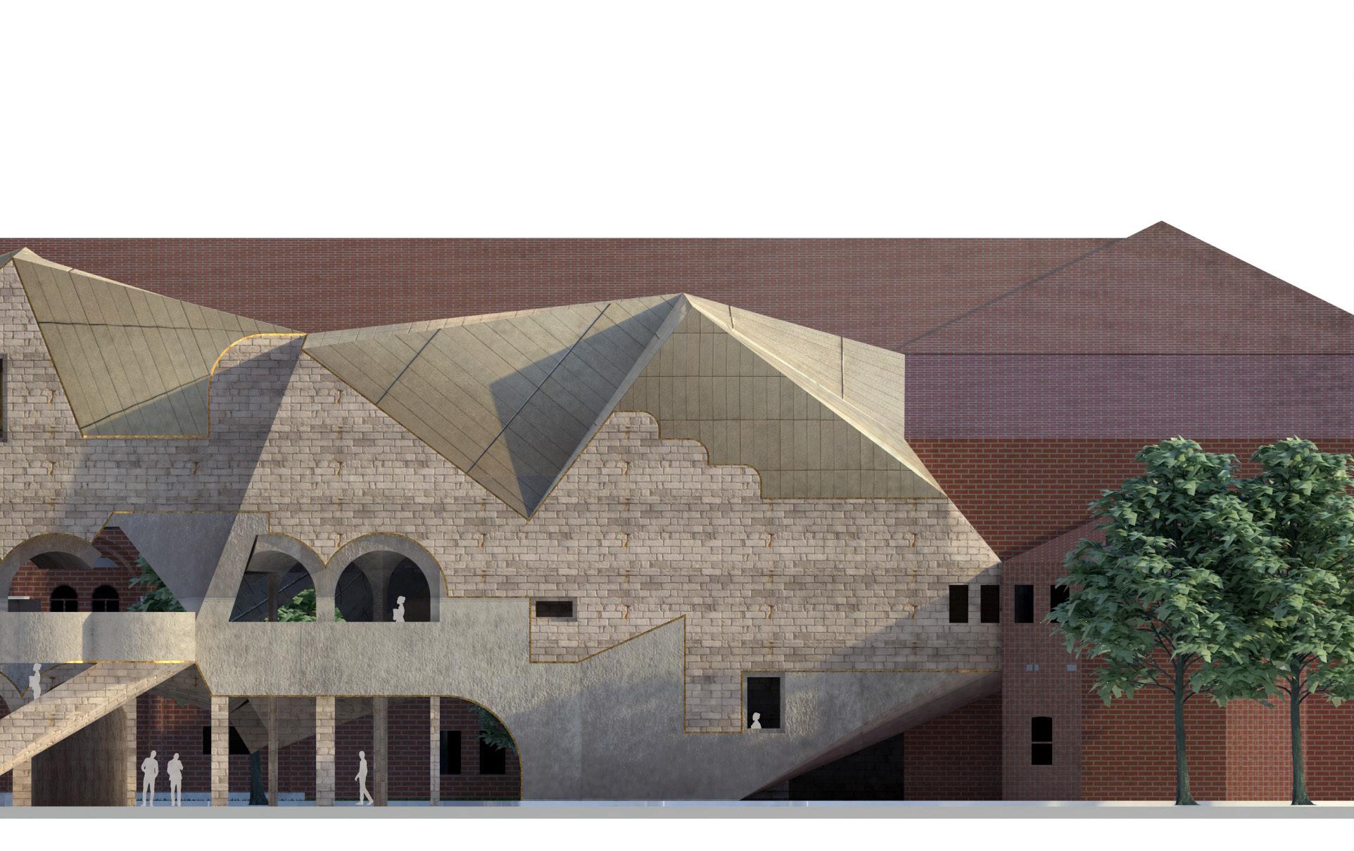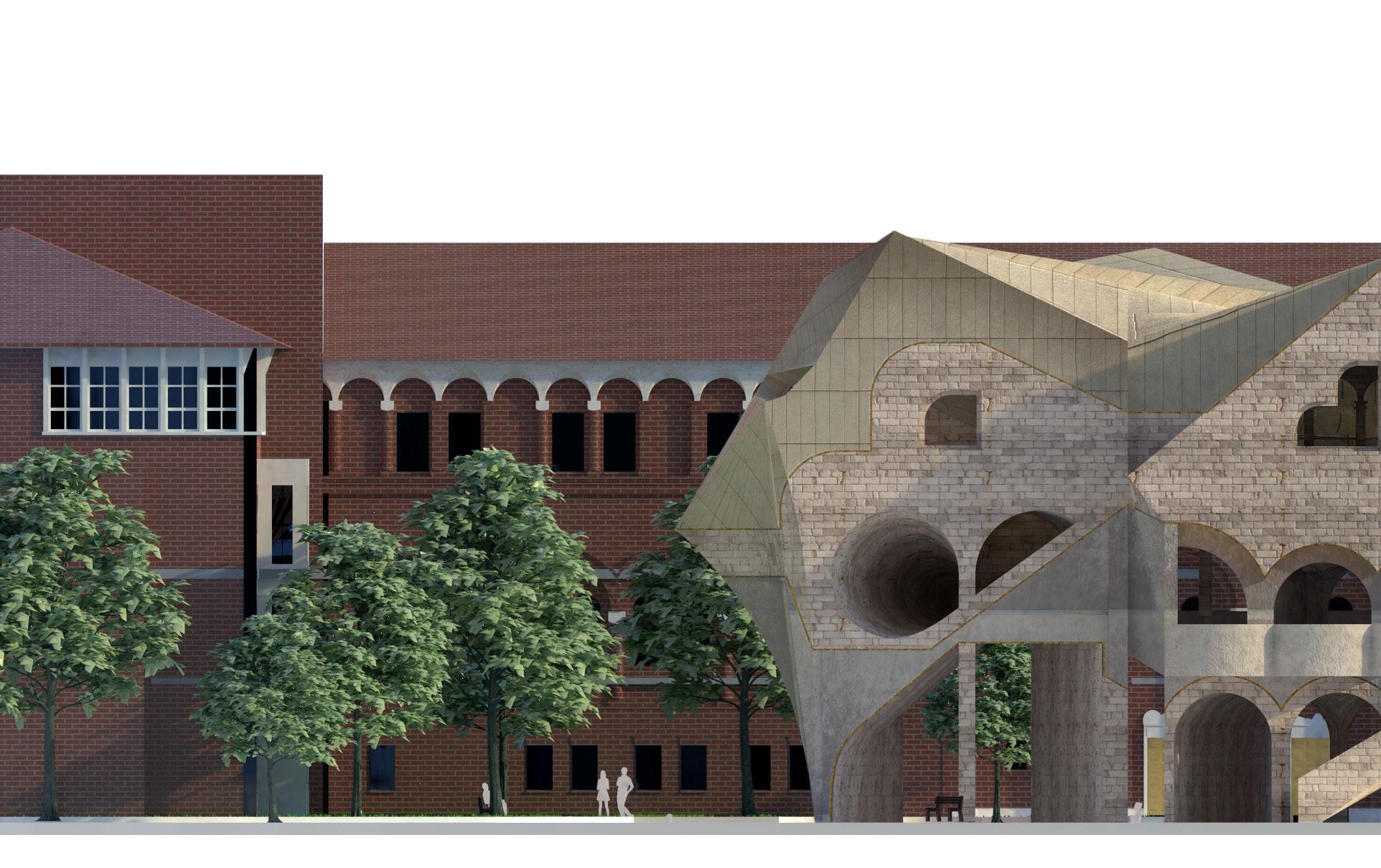 The classic elements from museum were simplified and redesigned to blend into the new form. The openings that arches created will also give a new definition of the structure being exposed to the passengers on the street. Visitors inside the building are able to observe the surroundings as well. The boundaries between the new structure and the museum will be blurry.