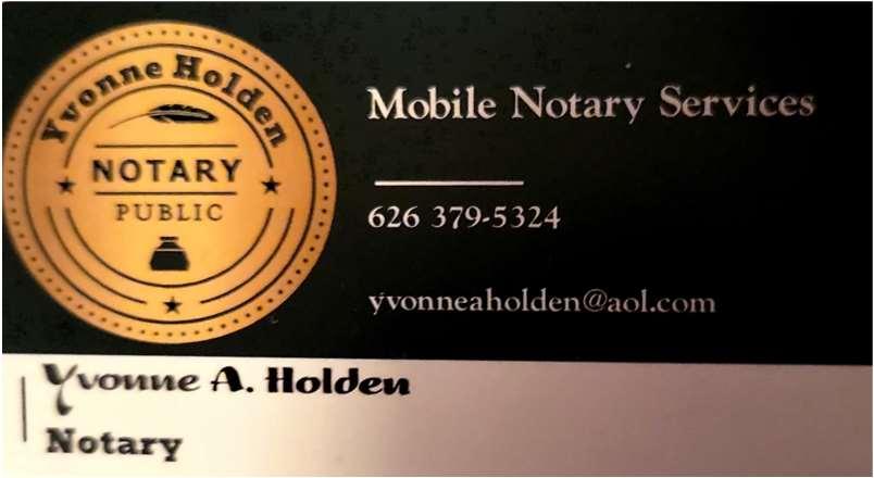 MobileNotaryServices 18 Mobilenotaryservices. Ownedby: YvonneHolden Address Duarte,CAZip yvonneaholden@aol.com 626-379-5324 FACContact:JeriHolden–818-363-4905or818-903-6349