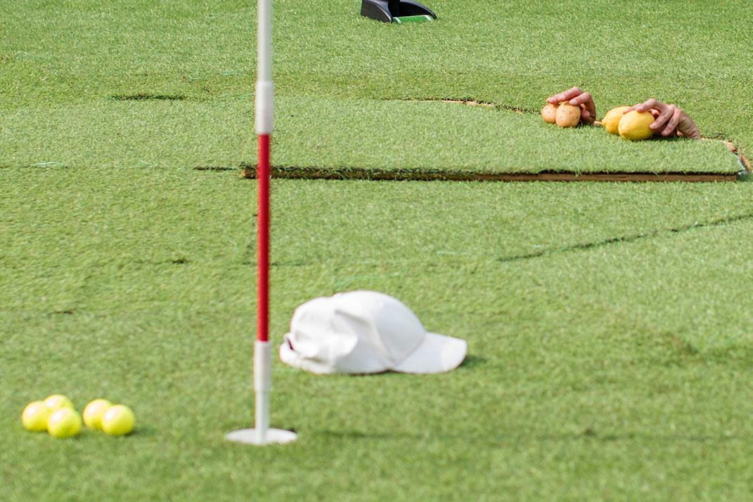 Acompañado de una pequeña pista de minigolf, nuestro profesor se dedica a recorrer todas las ciudades del mundo con la esperanza de convencer a todos y a todas de que se apunten a su escuela de golf.