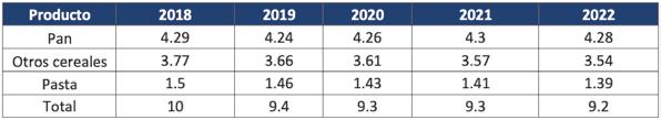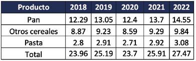 A lo largo de este período, se observa un crecimiento constante en el valor total del mercado, pasando de 23.96 millones de dólares en 2018 a 27.47 millones de dólares en 2022. El pan representa la mayor parte de este valor, experimentando un crecimiento continuo de 12.29 millones de dólares en 2018 a 14.55 millones de dólares en 2022.