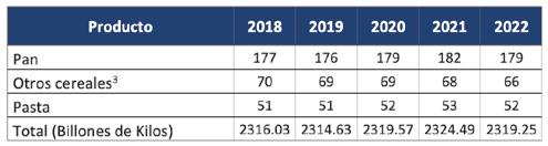 Acorde con STATISTA la producción de panificación no se vio tan afectada a nivel internacional con un total de 179 billones de kilogramos al año 2022, seguido por otros cereales elaborados, como harina, harina para hornear, sémola, cuscús y bulgur2
