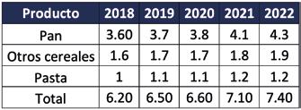 A nivel internacional la industria se observa con un aumento constante en el valor total del mercado, pasando de 6.20 billones de dólares en 2018 a 7.40 billones de dólares en 2022. El producto estrella indudablemente a nivel internacional es el pan, experimentando un crecimiento sostenido de 3.60 billones en 2018 a 4.3 billones de dólares en 2022.
