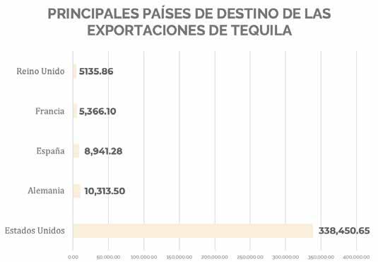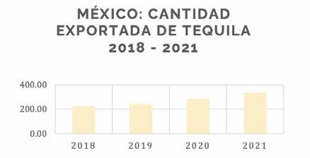 Por otra parte, el tequila desempeña un papel crucial en la industria de bebidas alcohólicas en México, destacando por sus significativos logros comerciales. En 2021, el valor de ventas de tequila superó los 54.000 millones de pesos mexicanos, evidenciando un crecimiento constante impulsado por la creciente demanda de este destilado elaborado a partir de agave. Este incremento en las ventas también se refleja en el ámbito internacional, con las exportaciones de tequila desde México aumentando de 64,6 millones de litros en 1995 a 339,4 millones de litros en 2021. Estados Unidos lidera como el principal destino de estas exportaciones, representando aproximadamente el 89% del total mundial .