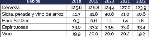 En el periodo de 2022, se observa que el consumo de varias categorías de bebidas alcohólicas se ha mantenido a nivel mundial. La cerveza se mantiene como la opción más popular. Por otro lado, las categorías de Sidra, perada y vino de arroz muestran una relativa estabilidad alrededor de los 40-41 billones de litros. Destaca el crecimiento constante de Hard Seltzer, pasando de 0.3 a 1.8 billones de litros, evidenciando una creciente preferencia por esta categoría.