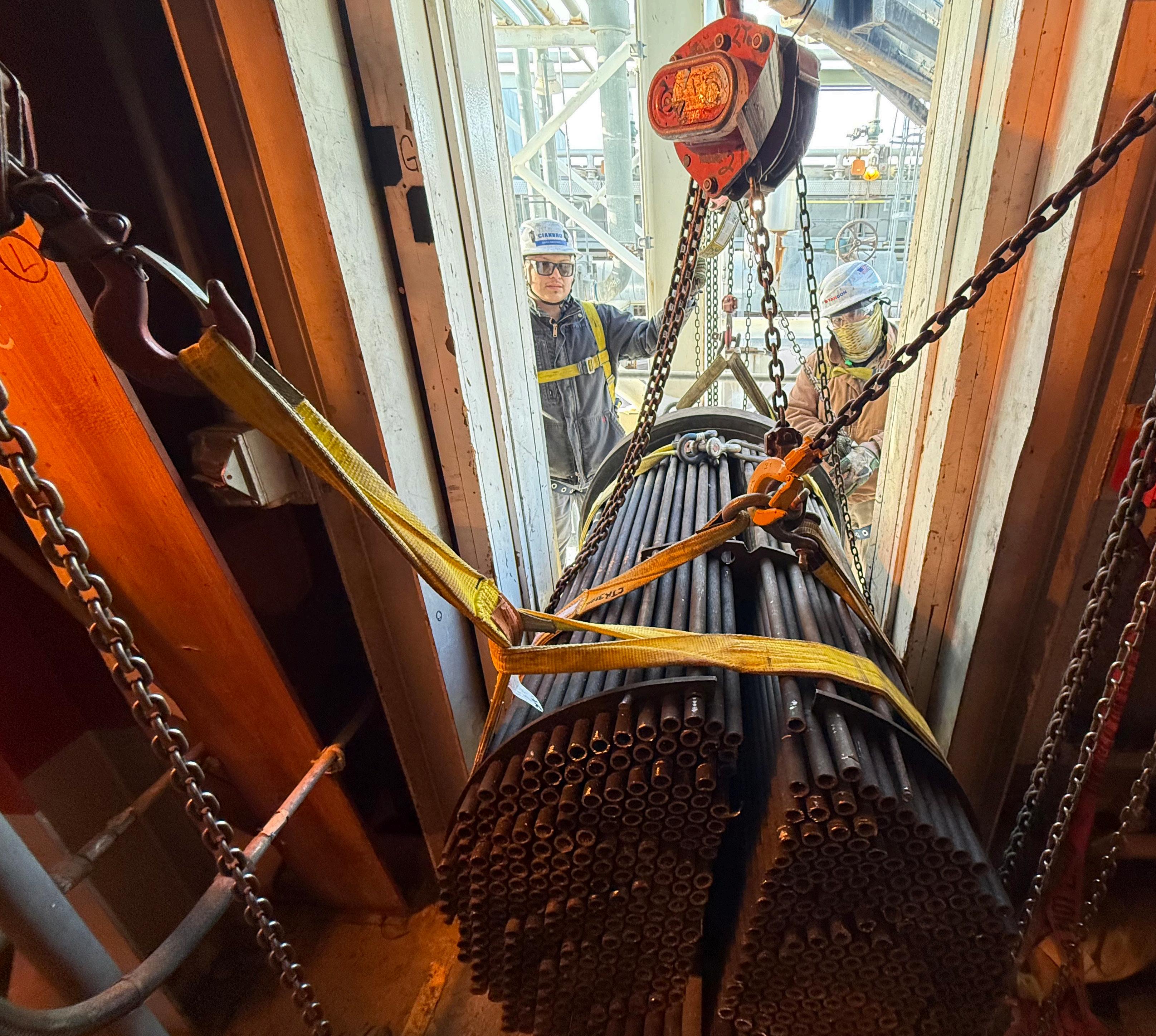 Starcon safely demolished Exchanger E-363 at Gathering Center 3 under tight, live-unit conditions using a cold-cut removal plan. Pictured left to right: David Martinez and Merardo Vargas.