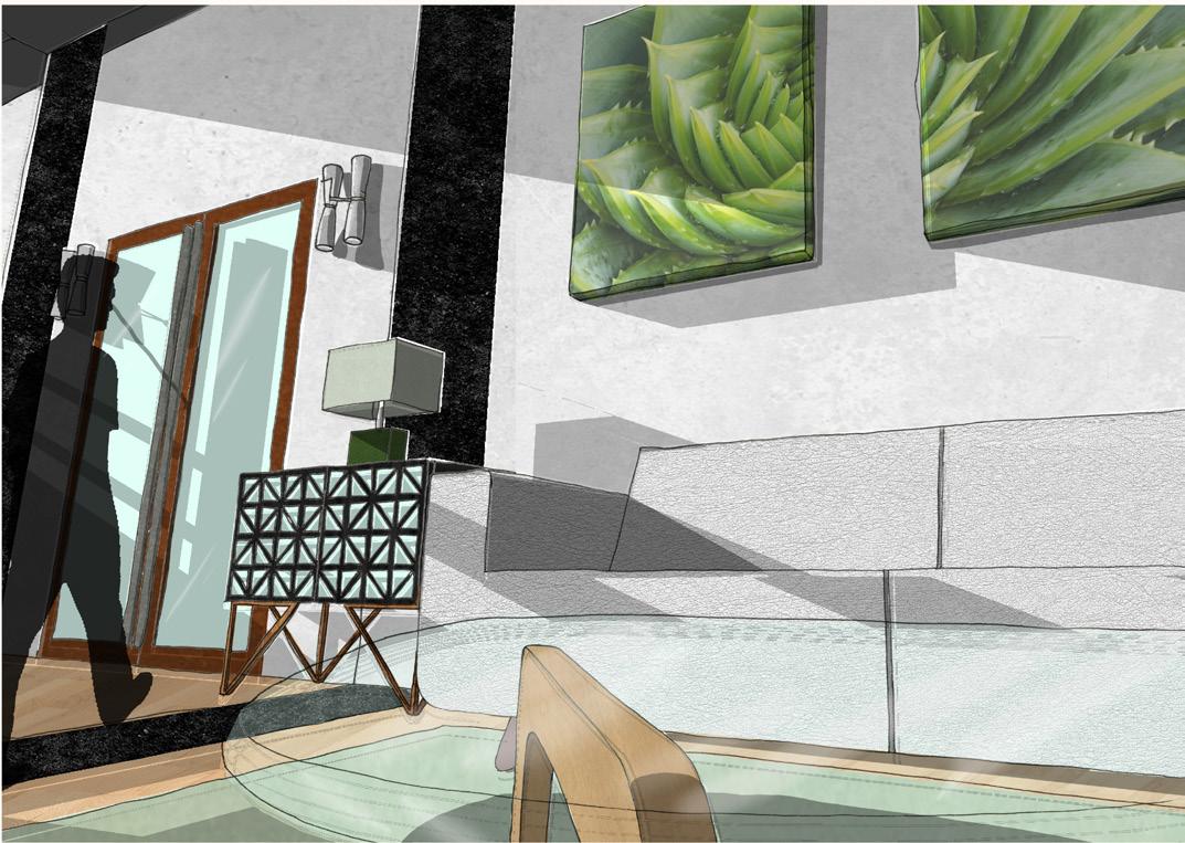 Primary Bathroom SuiteThe exterior patio offers an entertainment area, a dining area, and a kitchen. The kitchen is covered to allow use even when it is raining. Flooring changes delineate zones without using physical barriers.
