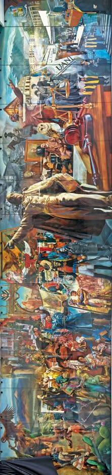 Título: La génesis como memoria histórica en el derecho. Autor: Jesús Agustín Castro López. Curador: Erik Castillo, crítico de arte moderno. Ubicación: Muro interior del frontispicio de la Facultad de Derecho y Criminología. Dimensiones: 27 x 3 m (81 m2)
