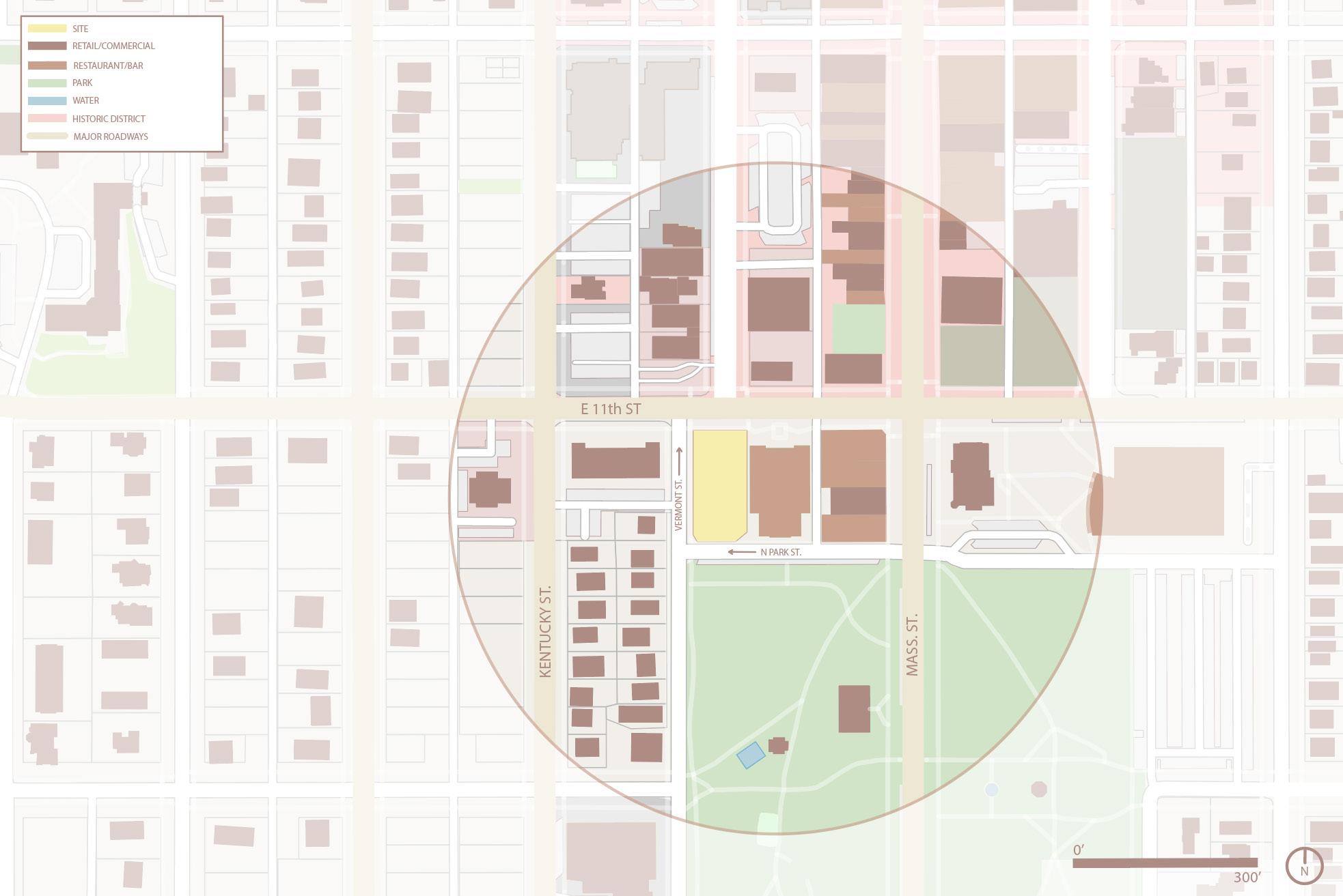 The site located at 11th and Mass encouages all modes of transport and multiple access points. The circle drive at the South entrance makes for an easy transition by vehicle due to the converging one-way roads. Parking is accessed along the circle with two ADA parking spots directly in front of the entrance. To the North, Pedestrians from the more populated 11th Street can enter the coffee shop or walk along the East side of the building to the outdor patio and into South Park. No parking or vehicle access to the North allows for the two different functions to be seperated and promotes alternate transportation such as bikes, public transport, and foot traffic.