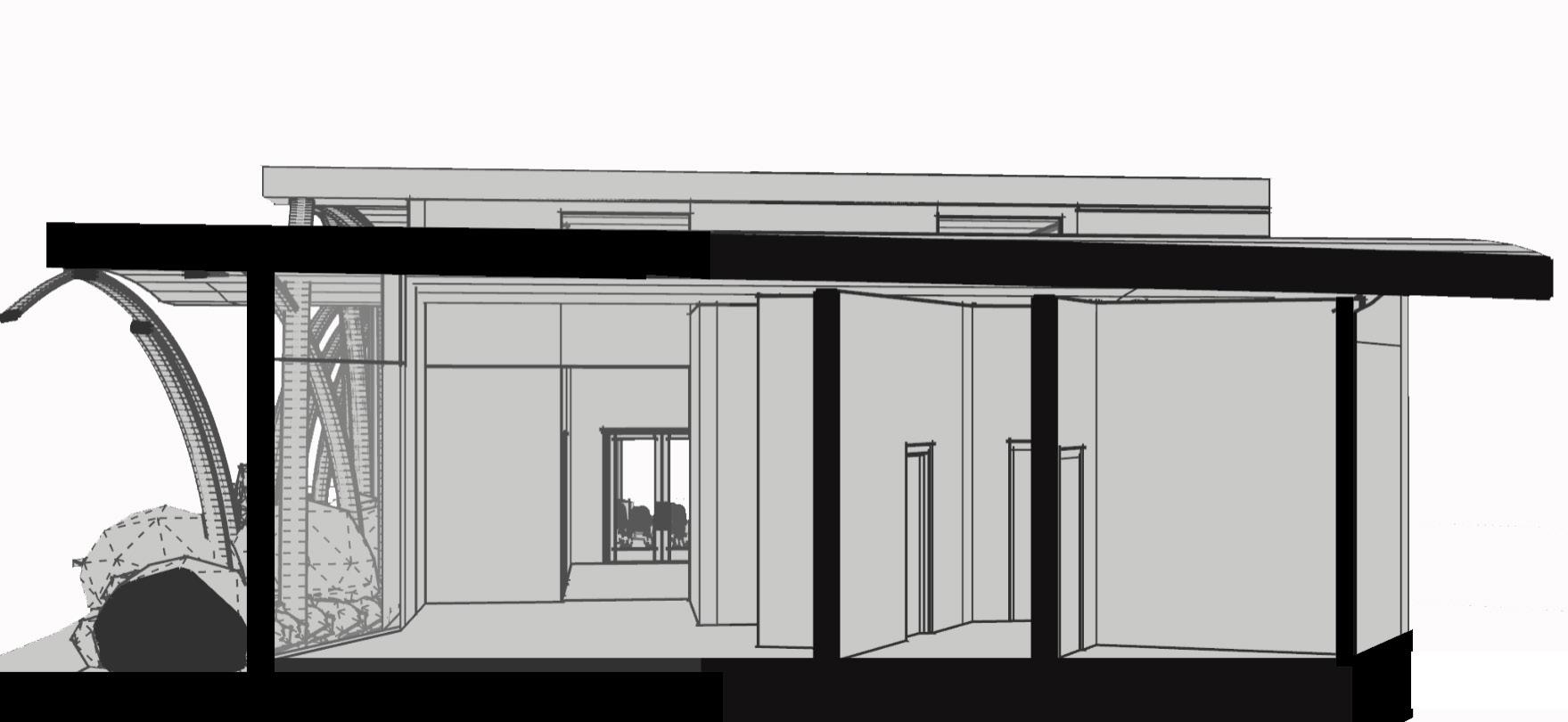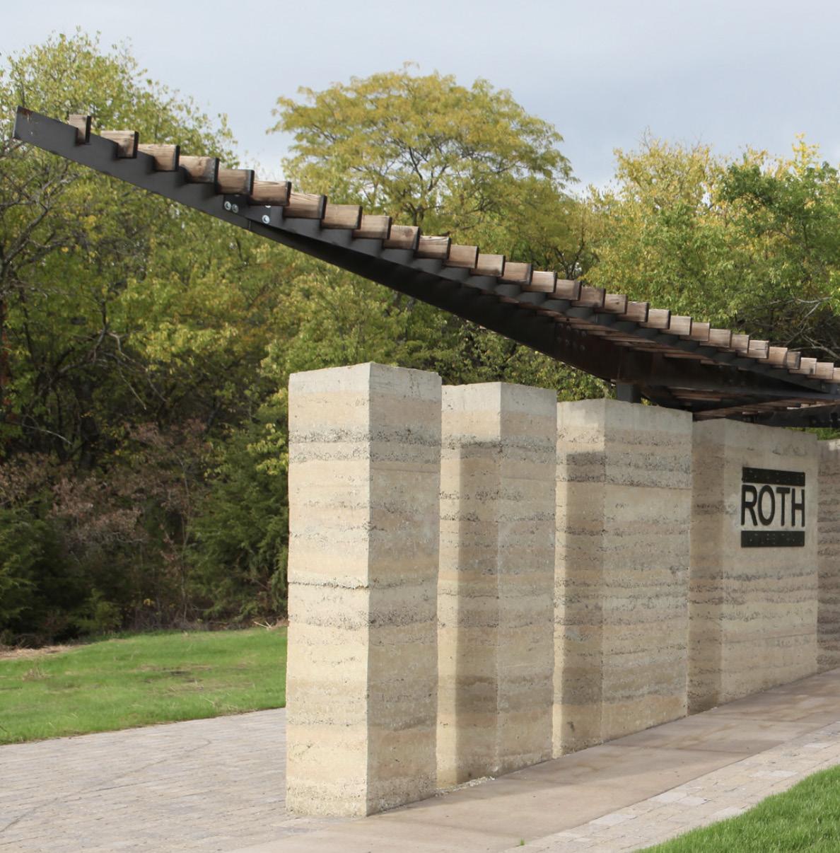 The entry to the KU field station Interpretive center is a direct nod to the shape of praire grass and the way in which it flows under strong Kansas winds. On either side of the front entrance, rammed earth walls frame the door connecting the building to the existing materiality of the Roth trailhead designed by KU’s design build program. Large overhangs provide shade during times of day with direct sun. Additionally, the front pathway connects to both the trailhead and the carved rock installation depicting the shape of the HERE-ing trail art.