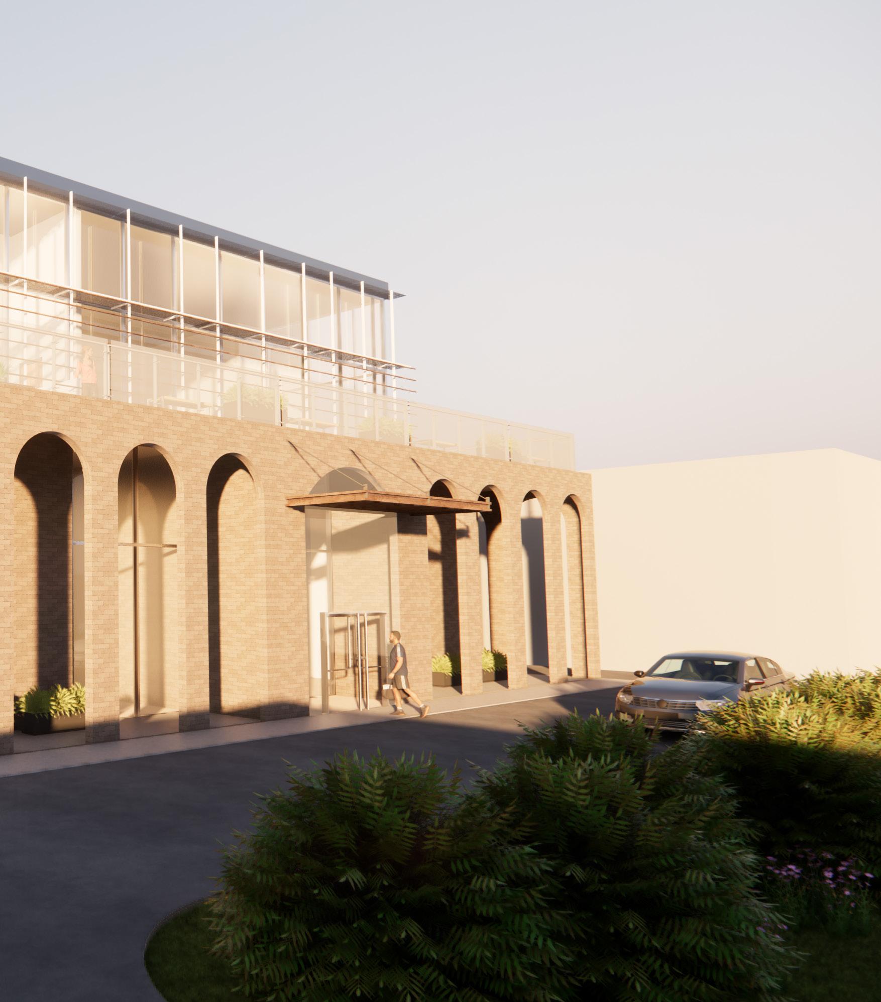 showing detailing of facade and arches. Overhangs and parking indications show overall building access and flow.
