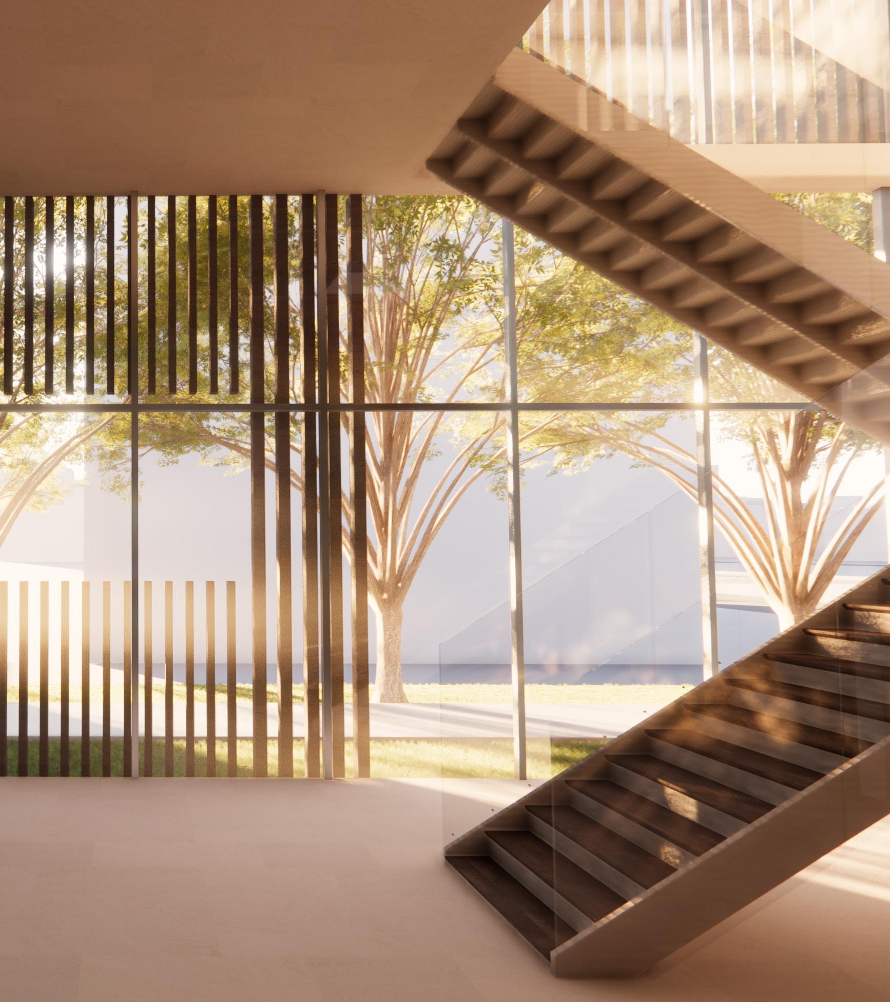 Interior Stair on Level 1 combined with the East facade openings shapes a view to the exterior inviting pedestrians in. Additionally the stair is positioned to allow visitors from each entrance to access the 2nd level with ease.