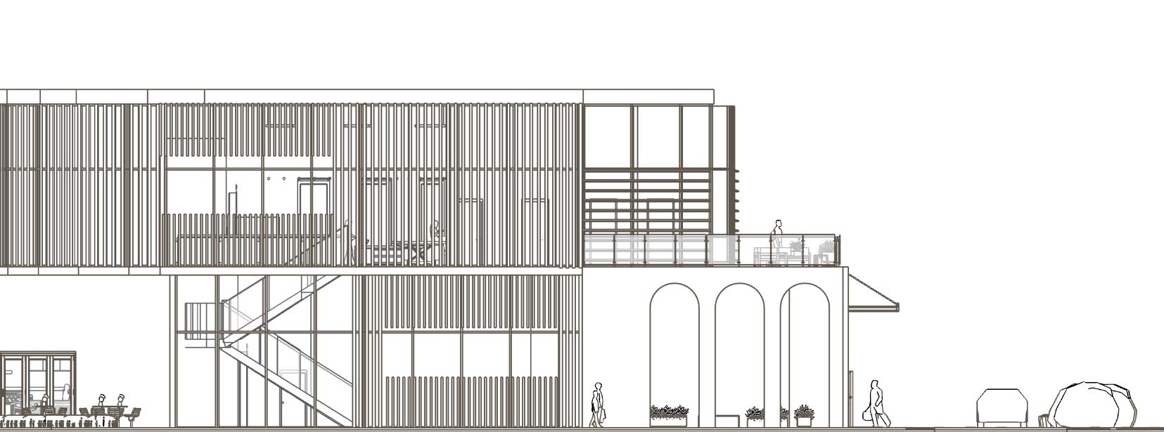 local Lawrence charm. Similar muted tones and continuity of materials connects the cafe to the PT center despite the differing functions.