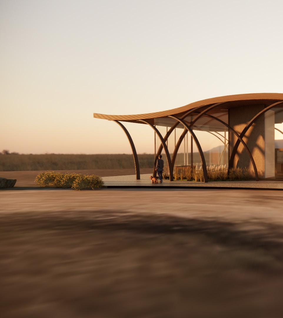 The interior design of the building is shaped by a warm material palette and a fluid connection to the outdoors, creating a space that feels open, inviting, and rooted in its landscape. Curved timber arches and a rhythmic wood ceiling introduce a natural texture that softens the structure while guiding light across the room throughout the day. Floor-to-ceiling glazing dissolves the boundary between inside and out, allowing shadows from the exterior framework to drift across floors and walls, animating the space with subtle movement. These patterns of light and shadow, paired with expansive views of the surrounding grasslands, immerse visitors in the environment and reinforce the project’s emphasis on learning, gathering, and connecting within nature.