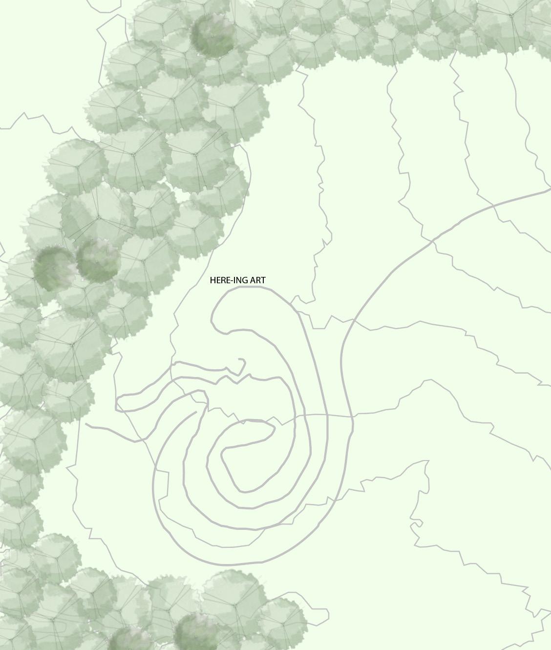The site is located at the Roth Trailhead just a short drive from the KU Fieldstation’s main learning center. The HERE-ing art instillation is an integral part of the site, as it attracts the majority of visitors throughout the year. The interpretive center is situated around the circle drive for easy access which allows for the buildings main views to extend out to the native praire grasslands. ADA parking is positioned in the existing platform directly behind the trailhead. Additionally the slight slope in topography allows for an elevated back deck setting visitors above the landscape to amplify views.
