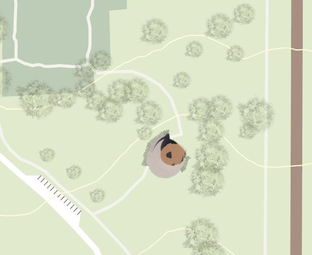 Pioneer Cemetary is located in West KU campus across Iowa Street, the main thoroughfare in Lawrence KS. Because it is situated near a busy roadway, the noise pollution from cars is a sigfnificant problem in the design process. A place for contemplation needs to be secluded and have ample noise control in order for it to be a peaceful environment. I addressed this problem by situating the building to the East which also captures important views to the North and South. By creating a circular walkway and seating area around the site it allows for visitors to feel as if they are a part of the landscape themselves. Two paths connect the building to the access road and parking as well as the cemetary entrance.