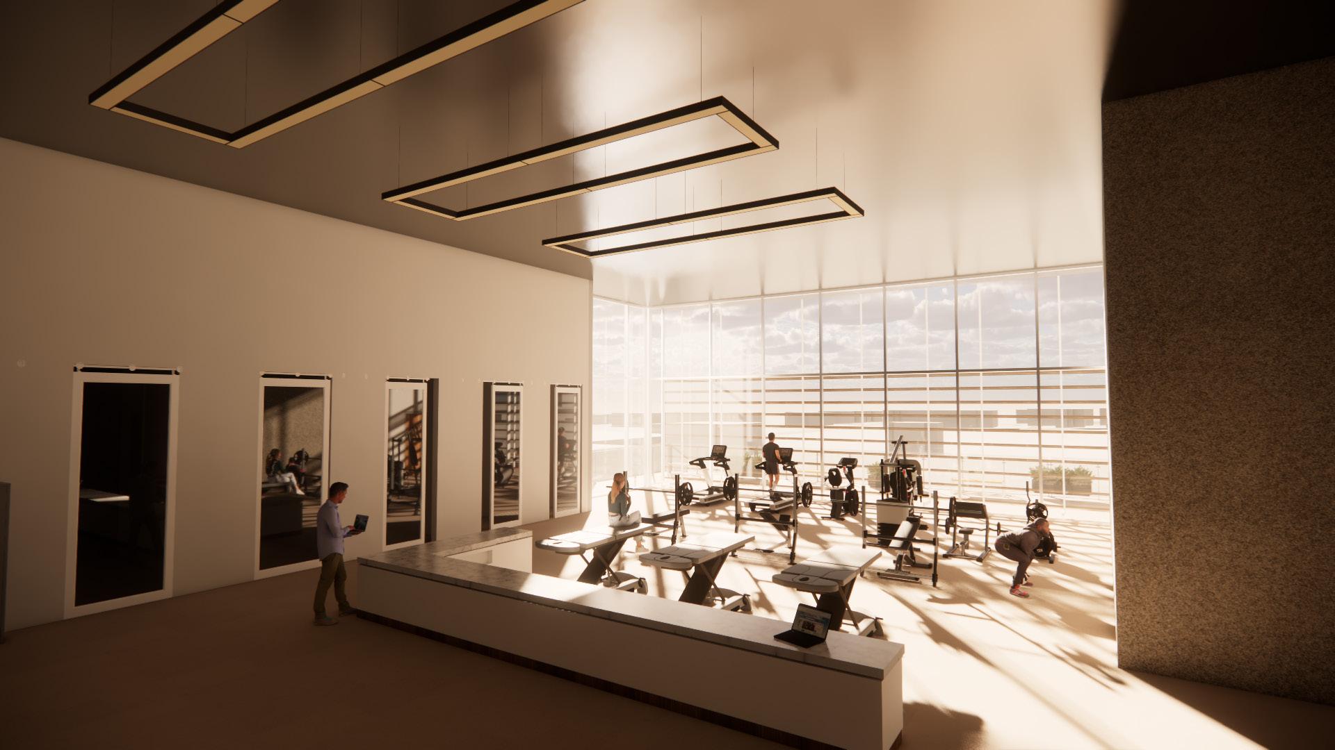 East Section showing 1st floor lobby space and 2nd floor gym connected to staff conference room. Outdoor areas to the North and South of the building caputure light filtration and access from the three main roads.