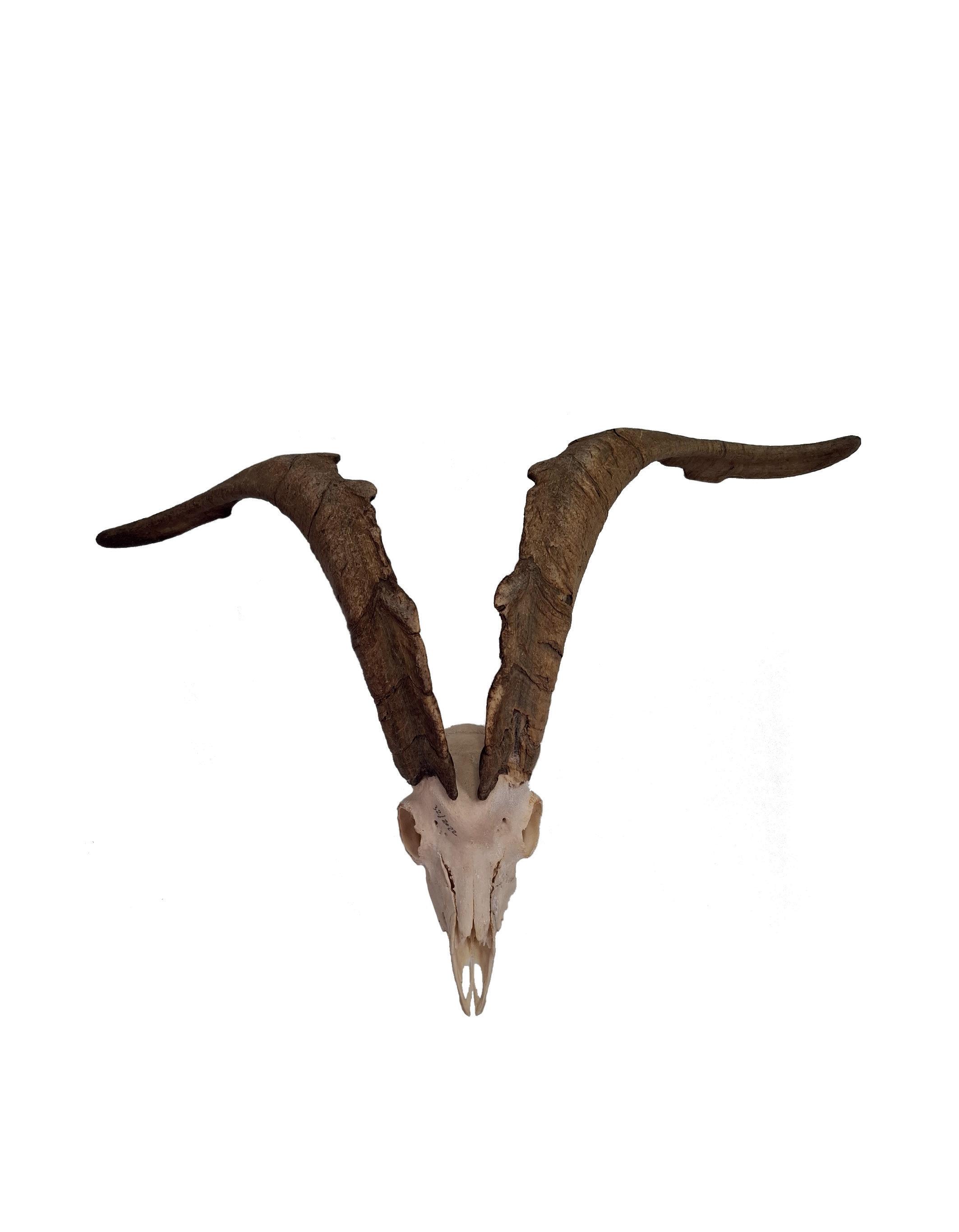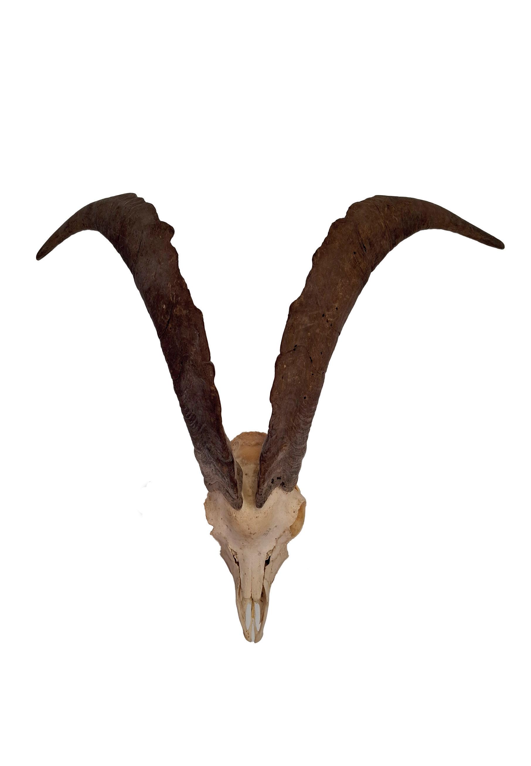 È possibile distinguere due tipi morfologici abbastanza definiti, seppure con non infrequenti casi intermedi (Cagnolaro et al., 1981, Spagnesi et al., 1982, 1986). Un primo tipo, conformato sostanzialmente a “scimitarra”, presenta i singoli corni rivolti indietro e apicalmente in basso, con modesta divergenza inter-apicale: è d’aspetto simile alle corna della capra selvatica di Creta. Il secondo tipo si sviluppa in modo più accentuato lateralmente, con un’ampia divergenza interapicale e presenta maggiori analogie con le corna di alcune razze di capra domestica. La differenza tra i due tipi di corna non è vistosa soltanto nel valore di divergenza inter-apicale, ma pure per l’angolo formato dall’asse maggiore della sezione del corno ai vari livelli e l’intersezione del piano della regione medesima col piano sagittale del cranio. Detto valore angolare è, a parità percentuale di livello di sviluppo del corno, molto inferiore nel tipo a “scimitarra” rispetto al secondo tipo. Le corna hanno una sezione grossolanamente piriforme, molto compressa, con il solo angolo anterointerno rilevato, carenato e provvisto, ad una certa distanza dalla base, di protuberanze largamente distanziate. La superficie interna ed esterna è piatta o leggermente convessa, posteriormente arrotondata e debolmente striata per la presenza di solchi trasversali e paralleli di accrescimento. La lunghezza del corno, misurata lungo il margine superiore, raggiunge a pieno sviluppo i 55-65 cm nei maschi (max. 71,5 cm in un individuo di 7 anni) e i 15-20 cm nelle femmine (max. 22 cm in un individuo di 6 anni). I ritmi di accrescimento delle corna nel maschio sono ben distribuiti nell’arco di più anni. Nel primo anno le corna raggiungono il 20% della lunghezza conseguibile a maturità, ad un anno e mezzo il 33% e a 2, 3, 4 anni compiuti rispettivamente il 43%, 52% e 62% circa. L’accrescimento continua però in modo decrescente fino a 11-12 anni circa. Il valore del settimo anno supera l’80% della lunghezza definitiva del corno ed a 8-9 anni si aggira tra l’85 e il 90%. La pausa annuale di accrescimento si colloca nel periodo invernale, nonostante esso rappresenti la stagione di massima disponibilità alimentare.